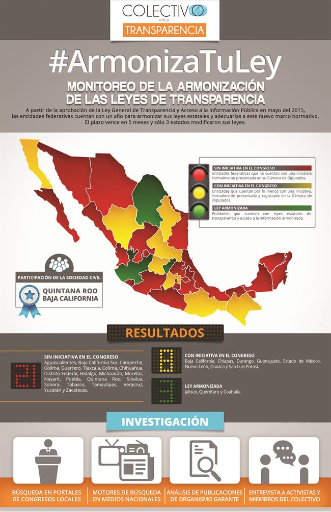 El plazo legal vence el 4 de mayo de 2016 y sólo Coahuila, Jalisco y Querétaro tienen un nuevo marco normativo. La participación ciudadana sigue siendo la excepción. Dos estados, Baja California y Quintana Roo, se destacan por estar implementando procesos formales de participación. CIUDAD DE MEXICO, D.F. 4 de diciembre de 2015.- En el marco de su décimo aniversario, el Colectivo por la Transparencia lanza la campaña #ArmonizaTuLey, un monitoreo del proceso de armonización de las leyes estatales con el nuevo marco normativo de acceso a la información y transparencia en el país, y señaló que todavía 29 estados, entre ellos Campeche, no han armonizado su ley estatal de Transparencia y Acceso a la Información. La organización civil manifestó que con la aprobación de la Reforma Constitucional en 2013 y la Ley General en 2014, México se ha dotado de un marco robusto y garantista en materia de transparencia y acceso a la información. El gran reto hoy es la implementación de este nuevo marco; y pasa primero por cumplir con las obligaciones en tiempo y forma. “El quinto transitorio de la Ley General de Transparencia establece que “el Congreso de la Unión, las legislaturas de los Estados y la Asamblea Legislativa del Distrito Federal, tendrán un plazo de hasta un año, contado a partir de la entrada en vigor del presente Decreto, para armonizar las leyes relativas…”, recordó. A partir de mayo del 2015, empezó a correr el plazo. Al concluir el séptimo mes, el Colectivo observó que la armonización solo se ha llevado a cabo en tres estados: Coahuila, Jalisco y Querétaro. Faltan cinco meses para que venza el plazo legal en mayo de 2016 y todavía 29 estados no cuentan con leyes adecuadas. “Es evidente que los congresos locales dejan para el final temas fundamentales que deben tratarse con la mayor apertura y discusión pública. Aunque poco, todavía hay tiempo”, destacó Guillermo Noriega Esparza, Coordinador de El Colectivo por la Transparencia. En varios estados donde están presentes organizaciones integrantes del Colectivo, no se han registrado ningún avance, estos nos comentan: “En Sinaloa, ni el órgano garante (CEAIP), ni la LXI Legislatura han iniciado aún esta discusión, de la que esperamos surjan las mejores propuesta para que los sinaloenses contemos con la mejor ley en la historia”, señaló Norma Sánchez, directora de Iniciativa Sinaloa. “En Yucatán, los legisladores anunciaron que la transparencia será un tema prioritario para el siguiente periodo ordinario de sesiones. No obstante, preocupa el antecedente en prácticas cerradas y en fast track que legislaturas anteriores han realizado en la materia”, comentó Booggar González, director de Información Accesible y Rendición de Cuentas, en Yucatán. El coordinador nacional de El Colectivo, insistió: “Si bien entre estos 29 estados, existen ocho estados que cuentan con al menos una iniciativa formal dentro de los registros de los Congresos locales, en 21 entidades no se ha documentado ni siquiera la existencia de un proyecto de iniciativa”. Más preocupante aún –reiteró Noriega-, “solamente dos estados, Baja California y Quintana Roo, han implementado procesos de participación ciudadana amplio y formal para que la sociedad civil pueda acompañar, vigilar y opinar sobre estos procesos legislativos”. En Baja California se ha organizado varios foros de consulta. Y en Quintana Roo se ha elaborado un proyecto de ley con la participación de amplios sectores de la sociedad civil. “Pero Quintana Roo y Baja California siguen siendo las excepciones. En general, los estados obstaculizan la apertura de los procesos legislativos. Por ejemplo, el gobierno poblano se sigue oponiendo a la participación de los ciudadanos a pesar de las reiteradas demandas de organizaciones”, concluyó. El Colectivo afirmó que todas las entidades estatales deben abrir sus procesos. La participación ciudadana es clave para impedir retrocesos en los marcos locales. En Jalisco, la movilización de organizaciones de la sociedad civil que denunciaron puntos regresivos en el dictamen elaborado a puerta cerrada fue determinante para que el estado se dote de una ley adecuada. “La armonización de las leyes estatales es una oportunidad para terminar con la asimetría del derecho a saber en el país, abrir las puertas del debate democrático a la ciudadanía y sentar las bases para un ejercicio auténtico del acceso a la información, elemento vital para la rendición de cuentas y el combate a la corrupción en México”, apuntó. En el marco del lanzamiento de la campaña #ArmonizaTuLey, el Colectivo por la Transparencia llamó a las y los diputados locales a respetar los tiempos legales, armonizar sus leyes estatales con base en los estándares más garantistas e involucrar a la ciudadanía en este esfuerzo.