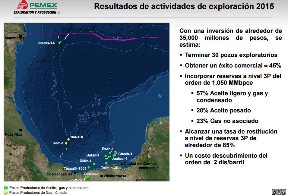 A 6 días de que se determine a los ganadores de la tercera licitación petrolera de la Ronda 1 y ante el bajísimo precio del petróleo, la compañía petrolera mexicana estima en los nuevos campos reservas 3P por 1,000 millones de barriles de petróleo crudo equivalente. Por Daniel Sánchez CIUDAD DEL CARMEN, Cam. 9 de diciembre del 2015.- En un reporte apresurado, a seis días de que se determine a los ganadores de la tercera licitación petrolera de la Ronda 1, la empresa Petróleos Mexicanos inyectó un poco de optimismo, ante el bajísimo precio del petróleo, y dio a conocer que hizo descubrimientos de nuevos campos, donde estima reservas por mil millones de barriles de petróleo crudo equivalente La compañía petrolera mexicana informó que los campos descubiertos, con la perforación de los pozos exploratorios Teocalli-1 –ubicado en el bloque adjudicado a la empresa italiana Eni-, Jaatsul-1, también en aguas someras; Hem-1, Cratos-1, Licanto-1 y Licayote-1 se suman a los cuatro anunciados en el primer semestre del año (Xikin-1, Batsil-1, Cheek-1 y Esah-1). Pemex manifestó que “durante el presente año, realizó la perforación de 30 pozos exploratorios, obteniendo éxito de 45 por ciento en su viabilidad comercial (superior al promedio internacional), lo que le permitió incorporar reservas totales 3P (probadas, probables y posibles) por alrededor de mil millones de barriles de petróleo crudo equivalente”. Precisó que del total de las nuevas reservas, 57 por ciento corresponden a crudo ligero y gas condensado, 20 por ciento a crudo pesado y 23 por ciento a gas no asociado, con un costo promedio de descubrimiento de dos dólares por barril. De este modo, la “empresa productiva” aseguró que “alcanzará una tasa de restitución de reservas 3P del orden de 85 por ciento, con lo que será posible revertir la tendencia a la baja que se ha registrado en este indicador. La inversión total en actividades de exploración en el año ascendió a 35 mil millones de pesos”. “Con los nuevos descubrimientos de los pozos Teocalli-1001 y Jaatsul-1 en aguas someras, se estima lograr una producción de 40 mil barriles y 30 millones de pies cúbicos de gas diarios. Aunados a los cuatro descubrimientos anunciados en el primer semestre de este año, la producción adicional en aguas someras aumentará en 140 mil barriles y 120 millones de pies cúbicos de gas al día para inicios de 2018”, en la Sonda de Campeche, indicó. A fin de dar certidumbre y acelerar el desarrollo de los campos descubiertos, Pemex dijo que desarrolla un importante programa de pozos delimitadores para el próximo año. “Para este fin, el Consejo de Administración autorizó asignar 300 millones de dólares, que permitirá impulsar el programa de delimitaciones. En este sentido, se delimitó exitosamente el bloque oriental del campo Tsimin, en aguas someras, en el Litoral de Tabasco, con lo que se podrá iniciar su desarrollo y posterior explotación”, agregó. “Por lo que respecta a aguas profundas, se logró delimitar el campo Nat, en tanto se descubrieron los campos Hem, frente a las costas de Veracruz, y Cratos, en el área del Cinturón Plegado Perdido, al norte del Golfo de México, frente a Tamaulipas. Actualmente, se delimita en esta misma área el campo Exploratus”, abundó. “Asimismo, en áreas terrestres se descubrieron en Veracruz dos campos cercanos a infraestructura actual (Licanto 1 y Licayote 1), que incorporarán una producción aproximada de cuatro mil barriles de petróleo y 90 millones de pies cúbicos de gas diarios a fines de 2016”, puntualizó. 151209 Prensa descubrimientos 2015