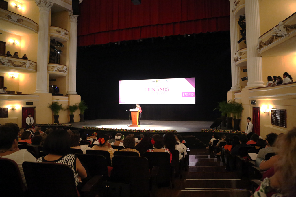 Refrendan políticas compromiso de pugnar por la igualdad/CIMACFoto: Angélica Jocelyn Soto Espinosa, enviada Por Angélica Jocelyn Soto Espinosa, enviada Cimacnoticias MERIDA, Yuc. 14 de enero del 2016.- Como hace 100 años, el Teatro Peón Contreras –construido con altos palcos y luces–, ubicado en pleno Centro Histórico de esta capital estatal, recibió a mujeres de todos los ámbitos para conmemorar un siglo de logros en materia de Derechos Humanos para las mexicanas, pero también para reflexionar sobre los pendientes. Si bien hace 100 años las mujeres reunidas en este histórico recinto donde se llevó a cabo el Primer Congreso Feminista, iniciaban un camino para que la población femenina ganara más derechos a participar en política y otros rubros de la sociedad, ahora –a un siglo de distancia– falta vencer obstáculos que impiden su plena participación en diversos ámbitos. En ello coincidieron diversas mujeres políticas al participar ayer en la primera jornada de actividades para conmemorar el centenario del Congreso Feminista, quienes señalaron que mientras hace un siglo se pensaba en cómo incorporar a las mexicanas a los cargos públicos, hoy se busca la paridad efectiva (mitad mujeres y mitad varones) en los espacios de poder. Y fue gracias a la participación de esas feministas que hace 100 años se reunieron en el Teatro Peón Contreras, que ahora quienes son magistradas, senadoras, diputadas, ex gobernadoras y académicas que participan en este evento conmemorativo, han podido llegar a esos altos cargos.