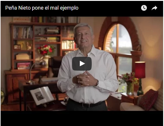 10amlo https://youtu.be/75WmnWNfBxg Cooperación para el desarrollo entre México y EU, en vez de construir muros, propone Andrés Manuel López Obrador CIUDAD DE MEXICO, D.F. 10 de marzo del 2016.- Andrés Manuel López  Obrador aseguró que ya hay un nuevo spot de Morena en las redes sociales, el cual se presentará el próximo viernes 11 de marzo, ante el Instituto Nacional Electoral, para que sea transmitido en los tiempos oficiales de radio y televisión. La liga del nuevo mensaje de Morena es http://on.fb.me/1pwofXG y dice: “No solo es el derroche, la ostentación, es también el mal ejemplo. Apenas habían comprado el avión de siete mil 500 millones de pesos, que no lo tiene ni Obama, ya habían comprado otro para el secretario de la Defensa y otro más  para el procurador, un avión de lujo de 80 millones de dólares, mientras al pueblo solo le entregan migajas,  despensas, frijol con gorgojo, y eso cuando necesitan los votos. Morena es la esperanza de México”. El presidente del Comité Ejecutivo Nacional de Morena dejó en claro que el spot respeta, aún bajo protesta, lo que decidieron los magistrados del Tribunal  Electoral del Poder Judicial de la Federación (TRIFE), “porque no hablamos del 18, cuidamos todo eso, pero son muy arbitrarios”. Explicó que los mensajes de Morena, aunque aparecen como el cometa, de vez en cuando, tienen aceptación por la gente, porque se dan a conocer cosas que se ocultan en los medios de información o que se tratan de manera muy general. Por ejemplo, lo del avión de presidencial de siete mil 500 millones de pesos no se trató lo suficiente, de por sí para que una noticia llegue al mayor número de ciudadanos, se requiere de repetición, eso está más que cobrado, en este caso, como no conviene al régimen se trata por encimita para cumplir con el expediente y no se sabe abajo. Aseguró que antes de que se subiera el spot del avión de Peña a los tiempos oficiales de radio y televisión, el tema solo se sabía, cuando mucho, el 1 por ciento de los mexicanos, ahora lo tienen que saber el 40 por ciento de los ciudadanos. Explicó que lo nuevo del spot de Morena es que así como Enrique Peña se compró un avión de lujo, el secretario de la Defensa, Salvador Cienfuegos, se compró un jet de lujo para uso exclusivo, pidió imaginarse la actitud si resucitara el general Felipe Álvarez y el ex procurador general de la República, Jesús Murillo Karam adquirió otra aeronave que costó 80 millones de dólares que se lo heredó la actual titular de la PGR. Dijo que al triunfo de Morena, se venderán los aviones de Peña, Cienfuegos y Murillo, porque es un abuso, un insulto, el que hayan comprado aviones con el dinero de los mexicanos. “Se viven tiempos de más autoritarismo” Al conceder una entrevista, vía telefónica, al periodista  Ciro Gómez Leyva en el noticiero “Ciro Gómez Leyva por la Mañana”, que se transmitió este día por la frecuencia 104.1 FM, López Obrador señaló que además no solo son los magistrados  del Tribunal, sino se viven tiempos de más autoritarismo. Señaló que la Secretaría de Gobernación es quien limita la aparición del spot de Morena en los tiempos oficiales y dio a conocer que tiene información que Miguel Ángel Osorio Chong reunió a los magistrados,  al viejo estilo de antes, para encargarles que quitarán el spot sobre el avión de Peña, porque le molestaba a Peña. Un magistrado, prosiguió, planteó que era un derecho constitucional, en el artículo 41 de la Constitución se establece que los partidos deben a dar a conocer sus plataformas y sus propuestas. Y como respuesta, Osorio Chong les contesto a los magistrados del Tribunal que era una decisión que se había tomado y los representantes del TRIFE lo tuvieron que acatar. Andrés Manuel indicó que “en este caso, nuestra propuesta es que haya austeridad, que no haya derroche, que no haya lujos en el gobierno” y llamó al titular de Gobernación, así como a los magistrados que aclaren si es cierta la reunión donde acordaron censurar el spot de Morena. Asimismo, López Obrador señaló que otro magistrado le dijo al secretario de Gobernación que por qué no utilizaban los tiempos oficiales del PRI para que los que aspiran a  ser candidatos aparezcan y Miguel Ángel Osorio contestó que eso no era posible, porque eso sería darle oportunidad al presidente del PRI, Manlio Fabio Beltrones. Informó que por cada mensaje de Morena, son 10 del PRI y 10 del PAN, es decir, de cada 100 mensajes, son 10 de Morena y 90 de los otros partidos, es una total desproporción. “Ellos tienen el problema de que no se ponen de acuerdo, deberían de ponerse de acuerdo, imagínate tres mensajes del ministro de economía del año del mejor del mundo, Videgaray”, sugirió. Al comentario Gómez Leyva que los priistas no se pueden dividir los tiempos oficiales, porque no pueden, la ley no se los permite, son funcionarios públicos, el presidente del CEN de Morena dijo que podrían grabar en los días que no hay labores, el domingo, y no hablar de funciones públicas, sino soy militante del PRI, eso sería una buena solución. Indicó que los cinco aspirantes del PRI para contender por la Presidencia de la República son: el secretario de Gobernación, Miguel Ángel Osorio Chong; el secretario de Hacienda, Luis  Videgaray; el presidente del PRI Nacional, Manlio Fabio Beltrones; el secretario de Educación Pública, Aurelio Nuño Mayer, y el secretario de Desarrollo Social, José Antonio Meade Kuribreña. “Entonces tienen ellos 10 mensajes, nosotros tenemos 1, le tocaría a cada uno 2, o sea, nos llevarían de todas  maneras de dos a uno, cada aspirante y ya con eso se deberían de tranquilizar”, manifestó al decir que el PAN tiene 10 mensajes y tiene como aspirantes Margarita Zavala, Rafael Moreno Valle, a ellos les toca más tiempo, y en el caso del PRD, el jefe de Gobierno del Distrito Federal, Miguel Ángel Mancera. Comentó que 
