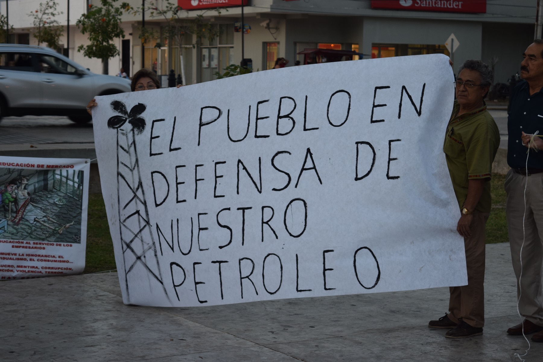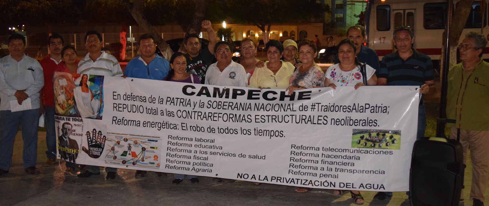 Por Ronny Aguilar CAMPECHE, Cam. 18 de marzo del 2016.- En el marco de la hoy inexistente “Expropiación Petrolera”, maestros, jubilados y telefonistas protestaron contra la Reforma Energética impuesta por el priísta Enrique Peña Nieto, en la Plaza de la República de esta ciudad capital, y se pronuncian contra la catástrofe que han provocado las mal llamadas reformas estructurales. Maestros de la Coordinadora Nacional de los Trabajadores de la Educación (CNTE), jubilados y pensionados federales, representantes del Sindicato de Telefonistas de México, de los trabajadores de la salud y profesores cesados por la Reforma Educativa, realizaron hoy una manifestación, en la cual se pronunciaron en contra de la Reforma Energética. Los líderes de las diversas corrientes de oposición a las reformas del PRI, señalaron que en estos momentos, la crisis en México se agudiza y es principalmente por las malas decisiones del gobierno federal que, apostando al capitalismo desmedido, ha empoderado a la oligarquía de este país privatizando todo lo que ha encontrado a su paso, siendo de los más graves el petróleo. Manifestaron que consecuencia de esta contrarreforma es que hoy tenemos miles de trabajadores de Pemex despedidos y en la calle, buscando empleo, algo que causa mayores índices de delincuencia y una evidente carencia en la movilidad económica nacional. Asimismo, los asistentes hicieron pronunciamientos, cada uno de acuerdo a su sector, y en el caso de Silverio Tuz Góngora, representante en el estado de la CNTE, aseguró que los maestros cesados no fueron notificados debidamente y los procedimientos fueron incorrectos. De la misma manera, Linda Domínguez, delegada de la Coalición Nacional de Jubilados y Pensionados “Elpidio Domínguez Castro”, afirmó de la necesidad de que los jubilados y pensionados del país sean resarcidos en sus pagos del concepto 02 y 03, además mencioinó que ya se está trabajando en una iniciativa que será presentada en la Cámara de Diputados, que pretende la rentabilización de la Seguridad Social. De la CNTE, también hablo el docente Gustavo Uc Pérez, quien expresó su repudio a la represión de maestros en el estado de Durango y dijo que como consecuencia de la represión, hay varios maestros heridos y desaparecidos.
