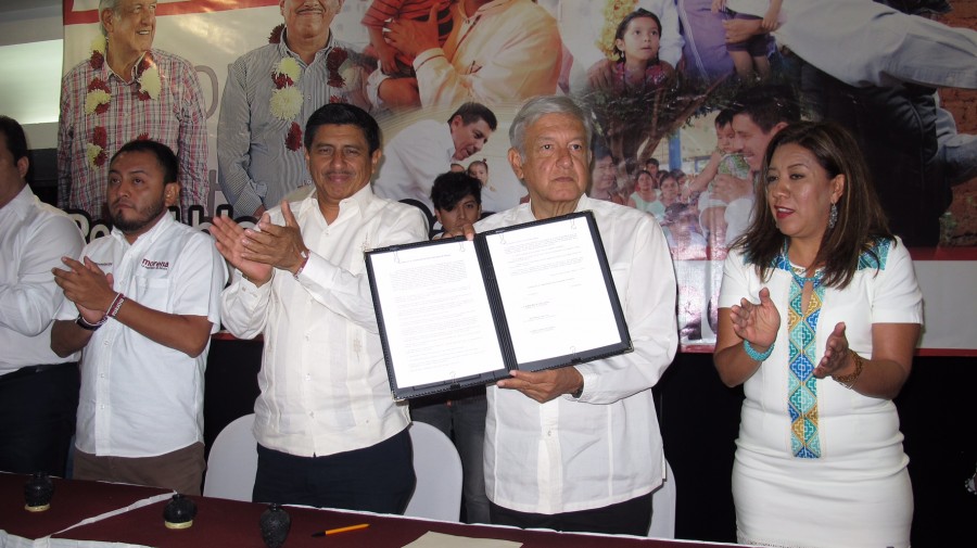 Firma dirigente nacional de Morena, candidato a la gubernatura y maestros Acuerdo por la Transformación de la Educación en Oaxaca, que permitirá que se lleve a la práctica un modelo de alto nivel académico, con dimensión social y cultural, fundado en el diálogo con los padres de familia, con los maestros, con las comunidades y con la sociedad en su conjunto.