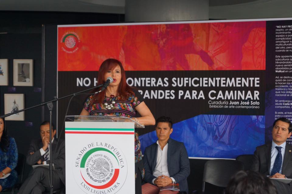 CIUDAD DE MEXICO, D.F. 5 de abril del 2016.- Senadores de la República, entre ellos Layda Sansores San Román, inauguraron en el Patio del Federalismo la exposición “No hay fronteras suficientemente grandes para caminar”, que muestra desde diferentes visiones el fenómeno de la migración en la frontera entre México y Estados Unidos. La senadora Layda Sansores, presidenta de la Comisión de Asuntos Fronterizos, expresó que mientras Trump amenaza con levantar muros, “nosotros, aquí, cavamos fosas para los migrantes de Centroamérica y de quienes vienen del sur”. Esto, subrayó, también debe ser un recordatorio indeleble para los mexicanos o caeremos en esa hipocresía de pedir justicia, pero permitir este genocidio, como le llaman los defensores de los migrantes del sur. Por su parte, el senador Ernesto Cordero Arroyo destacó que los mexicanos en Estados Unidos aportan el ocho por ciento del Producto Interno Bruto de ese país, pagan más impuestos que los servicios que reciben, y de cada dólar que ganan, 90 por ciento se queda en aquella nación y sólo 10 por ciento llega a México vía remesas. Por ello, opinó que los discursos de odio que se han dado en los últimos meses contra los connacionales en Estados Unidos es necesario responderlos con “la fuerza de la razón y de los argumentos y con la contundencia del arte y de la cultura”. La senadora Lilia Guadalupe Merodio Reza, presidenta de la Comisión de Atención a Grupos Vulnerables, comentó que la frontera norte es un espacio dinámico de relación política, económica y social, donde se desarrollan diversas actividades. Destacó que el comercio fronterizo con Estados Unidos es uno de los mayores a nivel mundial, además de que cada día más de un millón de personas cruzan la frontera legalmente; no obstante, consideró que uno de los retos a superar son las barreras culturales “que se traducen en muros infranqueables”. El senador Héctor Flores Avalos, presidente de la Comisión de Asuntos Fronterizos Norte, dijo que se debe encontrar la solución a diversos fenómenos que suceden en la frontera con Estados Unidos de manera constructiva, responsable y respetuosa para ambos países. Señaló que la relación entre ambos países es permanente, profunda y llena de riqueza, “que encuentra en sus contrastes la mejor forma de definiros, de acercarnos y de apreciarnos”. Juan José Soto, quien realizó la curaduría de la exposición, señaló que la insatisfacción generalizada a nivel global frente a modelos económicos y políticos desgastados, es lo que abona el terreno de visiones y discursos demagógicos, radicales y autoritarios como los de Donald Trump. Consideró que la complejidad multicultural por la que ahora atraviesan las naciones, debido al fenómeno migratorio, debe ser una alerta para replantear el papel de lo político como un criterio inevitable, transitorio y evolutivo en pro de una mejor ciudadanía.