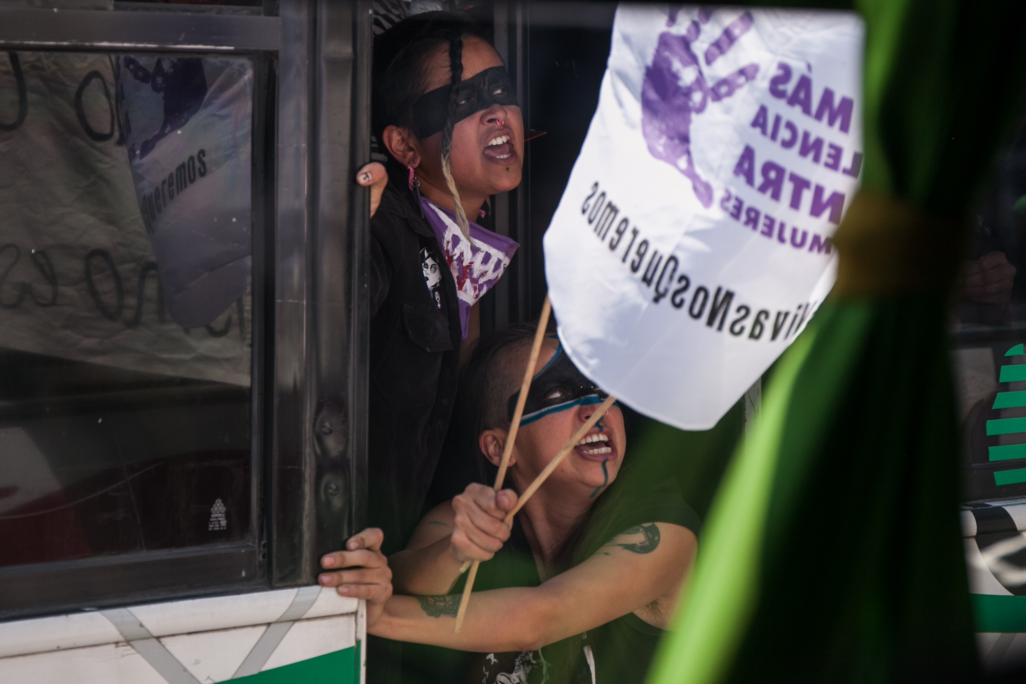 Ecatepec | César Martínez López Ataviadas de camisetas de color morado, con banderas, tambores y silbatos, las mujeres hicieron lo que cientos de trabajadoras y estudiantes deben hacer cada madrugada: abordar los camiones o las combis que salen desde Ecatepec y recorren la autopista México-Pachuca o la Vía Morelos para llegar al Metro Indios Verdes, y seguir su recorrido; un camino donde el acoso o la violación sexual son latentes. Este domingo fue diferente. Orgullosas de ser mujeres y de ser diversas, las asistentes abordaron los camiones para llevar sus gritos: “No fue un crimen pasional fue un macho patriarcal; no, no, no fue un hecho aislado, los feminicidios son crímenes de Estado”. Las frases resonaron en el centro del país e incluso llamaron la atención de las capitalinas ajenas a estas denuncias. Cada voz era en memoria de tantas víctimas; mujeres como Mariana Lima Buendía, asesinada presuntamente por su esposo en el municipio de Chimalhuacán, en 2010; o de Nadia Alejandra Muciño Márquez, ultimada también por su esposo en presencia de sus tres hijos menores de edad, en Cuautitlán Izcalli, en 2004. Después de recorrer avenidas rodeadas de fábricas, casas humildes, pequeños negocios y calles empobrecidas, las manifestantes llegaron al Metro donde apretujadas en los vagones, como siempre sucede en los espacios destinados para las mujeres, siguieron sus cánticos de lucha, pero esta vez con la rabia en la garganta de todas las veces que un hombre las ha tocado. La tarde de ayer, la impotencia de sentir la agresión se convirtió en el grito de “¡Con falda o pantalón, respétame, cabrón!”, y es que todas tenían una anécdota dolorosa de acoso, situación que confirmó un estudio de la Fundación Thomson Reuters, que ubicó al transporte de la Ciudad de México como el segundo más peligroso en el mundo para las mujeres, sólo superado por el transporte de Bogotá, la capital de Colombia.