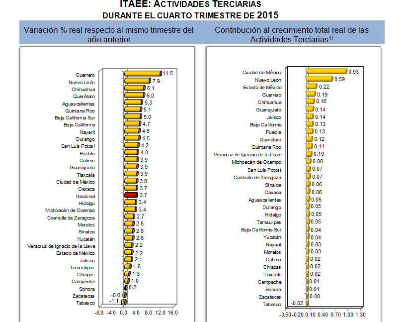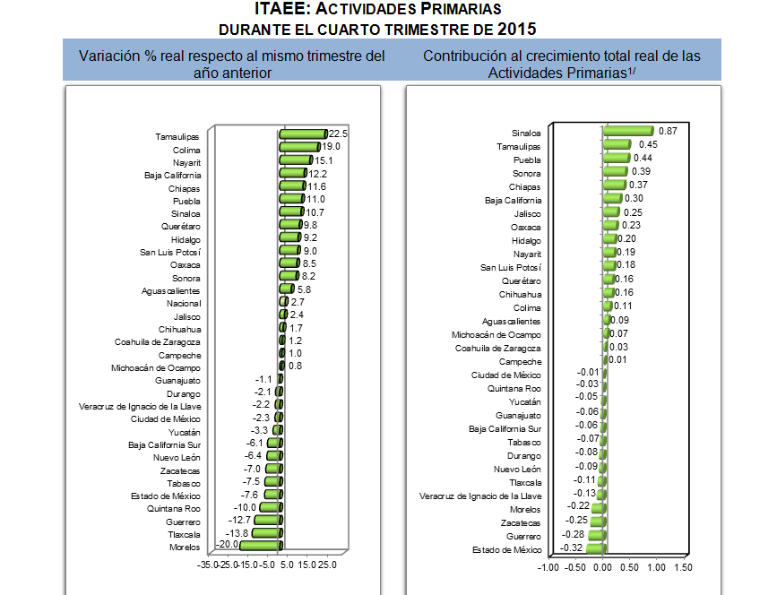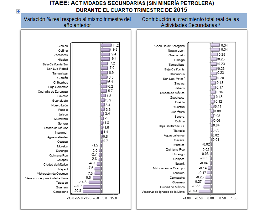 28eco3 El Inegi da a conocer en su Indicador Trimestral de la Actividad Económica Estatal (ITAEE) que Campeche cayó 8.1% más en el cuarto trimestre del 2015, y suma su octavo trimestre sin crecimiento. 28eco9 El Instituto señala que en los sectores primario y terciario, el estado creció 1%, pero en las actividades secundarias, cayó 9.6% con minería petrolera, y 20.8%, sin la industria extractiva de hidrocarburos. Por Daniel Sánchez CAMPECHE, Cam. 28 de abril del 2016.- Pese a los anuncios rimbombantes de obras, acciones y programas del ilegítimo y espurio Alejandro Moreno Cárdenas, la actividad económica del estado de Campeche cayó un 8.1 por ciento más en el cuarto trimestre del año 2015, según dio a conocer el Instituto Nacional de Estadística y Geografía (Inegi). Según los resultados del Indicador Trimestral de la Actividad Económica Estatal (ITAEE), dados a conocer este jueves por el Inegi, este es el octavo trimestre que el Producto Interno Bruto Estatal (PIBE) de Campeche no crece. En el documento, destaca que los sectores primario y terciario subieron apenas uno por ciento, mientras que las actividades secundarias cayeron 9.6 por ciento, incluyendo la minería petrolera, y 20.8 por ciento, sin la industria extractiva petrolera. 28eco8 Este indicador de coyuntura, que ofrece un panorama sobre la evolución económica de las entidades federativas del país, destaca que Campeche fue la única entidad que no pudo avanzar entre octubre y diciembre del año 2015, y el indicador original era de menos 8.2 por ciento. Con números negativos, además del estado de Campeche, estuvieron Tabasco, con menos 0.1 por ciento, y Veracruz, con menos 2.1 por ciento. Según el Instituto, durante el cuarto trimestre del año pasado, las entidades federativas que tuvieron los mayores incrementos con cifras desestacionalizadas respecto al trimestre previo en su actividad económica fueron Colima, Hidalgo, Chiapas, Puebla, Guanajuato, Querétaro y Sonora, principalmente. En su comparación anual, los estados que sobresalieron por el aumento en su actividad económica fueron Chihuahua, Colima, Nuevo León, San Luis Potosí, Hidalgo, Baja California, Sinaloa y Baja California Sur, con series ajustadas por estacionalidad frente al cuarto trimestre de 2014. El ITAEE incorpora información preliminar de distintas actividades económicas como las agropecuarias, industriales, comerciales y de servicios, por lo que debe considerarse como un indicador de tendencia o dirección de la economía a nivel estatal en el corto plazo. 28eco7 28eco6 28eco5 28eco4