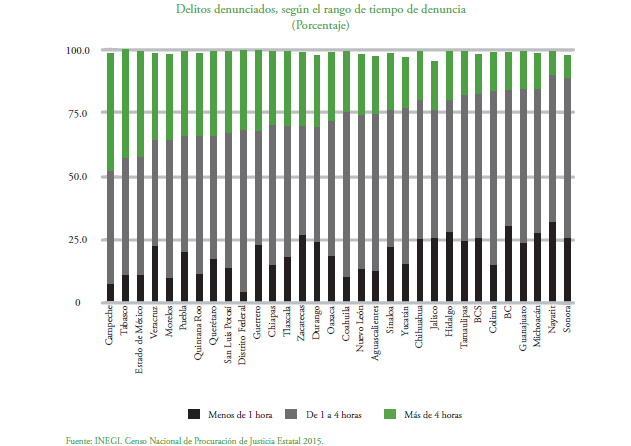 Por Daniel Sánchez CAMPECHE, Cam. 5 de mayo del 2016.- Campeche apenas alcanzó 281 de mil puntos ideales y se ubica entre los cuatro últimos estados del país en la implementación y operación del nuevo sistema de justicia penal, a unas semanas de que se venza el plazo constitucional, determinó el Centro de Investigación para el Desarrollo A.C. (CIDAC). Con el apoyo de la Agencia de los Estados Unidos para el Desarrollo Internacional (USAID), el CIDAC dio a conocer el reporte denominado “Hallazgos 2015: evaluación de la implementación y operación a ocho años de la reforma constitucional en materia de justicia penal”, en el que destaca también de que la Fiscalía General campechana “tarda, en promedio, más de cuatro horas para recibir las denuncias de más del 40 por ciento de los delitos del fuero común”. En el comparativo sobre “delitos denunciados, según el rango de tiempo de denuncia”, Campeche aparece como el peor estado de la República Mexicana, al tener menos del 10 por ciento de las denuncias atendidas en menos de una hora, más del 40 por ciento entre una y cuatro horas, y otro porcentaje similar, en más de cuatro horas. El CIDAC precisó que la clasificación en “el ranking del avance en la implementación” la realizó en función del avance y calidad del proceso de implementación de la reforma penal, que duró ocho años, “con el objetivo de conocer el nivel de avance que presenta cada una de ellas”. “Este ejercicio, como en años anteriores, se realizó con base en la metodología desarrollada por CIDAC, en la que se hace una valoración de las condicionantes de la implementación. Para ello, se aplicaron los indicadores que permiten ordenar el avance y calidad de las entidades federativas en los siguientes ámbitos: a) coordinación y flujo de información, b) simetría institucional, c) ritmos de la implementación y d) participación ciudadana”, explicó. “El estándar se ha conceptualizado partiendo del reconocimiento de que, durante y después de la aplicación de una política pública, las instituciones y los operadores generan procesos de mejora continua. Por tal motivo, incluso a punto de que se venza el plazo constitucional para que el sistema penal acusatorio se encuentre operando de manera total en todo el país, se estableció un estándar de 800 puntos, de mil posibles, como el ideal alcanzable en la operación del sistema”, indicó. “Como mencionamos, a pesar de estar a pocas semanas de que se cumpla el plazo establecido en la Constitución para la implementación de la reforma penal, para 2015 se propuso un estándar de 800, por debajo de los 1000 puntos ideales. No obstante, en ninguno de los casos, las entidades federativas lograron alcanzar, siquiera, el estándar establecido para el año 2014, que fue de 730 puntos; y únicamente seis entidades han superado el estándar de 2013, como se observa en la siguiente figura”, agregó. Aseguró que el avance o retroceso que muestran algunas entidades federativas frente a la clasificación en el ranking 2014 se debe a distintos factores. Uno de ellos es, evidentemente, el tiempo, pues ante la inminencia del plazo constitucional, las instituciones se han visto en la necesidad de redoblar esfuerzos y se han obligado a tomar medidas en las condicionantes de la operación del sistema de justicia. Esta proximidad en el tiempo puede ser un arma de doble filo, pues la prisa ha implicado también que se tomen medidas dentro de las instituciones, sin mediar planeación y coordinación. “Otro factor que puede ser determinante es que haya existido un mayor nivel de coordinación interinstitucional en las entidades federativas, lo que se traduce en un proceso de implementación más eficiente, que impacta en el mejor posicionamiento de una entidad federativa frente a las demás. Por el contrario, la ausencia de políticas públicas claras y efectivas de coordinación institucional, afectaron el desempeño institucional y el impulso de la implementación, lo que impactó en la valoración que se dio a algunas entidades”, abundó. “A pesar del avance que se dio en algunos casos, resulta preocupante el hecho de que no se haya logrado alcanzar, ni siquiera, el estándar establecido para 2014. Es evidente que aún no estamos cercanos al logro del objetivo de contar con un sistema de justicia penal eficaz, eficiente y que asegure el respeto de los derechos humanos de los imputados y las víctimas”, alertó.