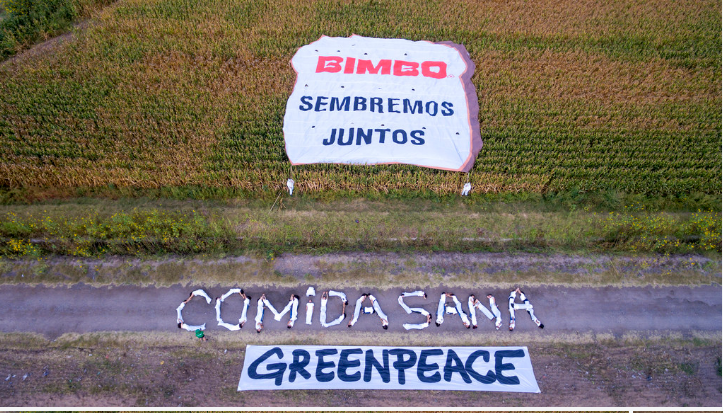 CULIACAN, Sin. 11 de mayo del 2016.- “Sembremos juntos comida sana”, fue el mensaje que consumidores, agricultores y activistas de Greenpeace lanzaron a Bimbo desde campos de cultivo de maíz en Sinaloa, estado donde la panificadora se abastece de insumos para su materia prima, para pedirle que se comprometa públicamente a transitar hacia una producción agroecológica. “Es momento de que la empresa escuche a la gente y se comprometa públicamente a impulsar la agricultura ecológica en México para demostrar el cariño de siempre a sus consumidores y a quienes desde el campo trabajan para producir los insumos que utiliza”, dijo Sandra Laso, responsable de la campaña Comida Sana, Tierra Sana de Greenpeace México. Manifestó que el modelo de agricultura a gran escala que abastece a la industria alimentaria, de la cual Bimbo forma parte, tiene graves impactos en los recursos naturales como el suelo y la tierra, además de que pone en riesgo la salud de las personas por el uso de sustancias altamente tóxicas, algunas de las cuales han sido prohibidas en otros países pero se siguen utilizando en México (1). “Ante un sistema alimentario roto, que contamina y produce comida chatarra, es urgente que se apoye a las y los productores que ya están produciendo comida sana libre de agrotóxicos en el país”, añadió la activista. Alrededor de 60 personas participaron en la actividad en los cultivos de maíz, ingrediente que utiliza la empresa en forma de harinas y edulcorantes, como el jarabe de maíz de alta fructuosa, y desde donde se desplegó una manta de 400 metros cuadrados con la forma de una rebanada de pan y la leyenda “Bimbo sembremos juntos”, mientras que la gente formó la frase Comida Sana, para invitar a la empresa a que lleve alimentos de mejor calidad ambiental y nutrimental a los hogares mexicanos. “Hace unas semanas, Greenpeace lanzó una petición en línea dirigida a Bimbo para que asuma su responsabilidad como empresa líder dentro del sector alimentario y transite hacia la agricultura ecológica; la cual ha sido respaldada por más de 20 mil personas, quienes estamos esperando a que la empresa acepte el reto”, señaló Sandra Laso. Aseguró que el actual modelo de producción de agricultura industrial está caracterizado por grandes monocultivos, el uso de transgénicos y de agrotóxicos, agravando la situación climática y produciendo alimentos pobres de nutrientes que llegan a nuestra mesa. “Ejemplo de ello, es el efecto de los fertilizantes sintéticos que además de causar la erosión de los suelos a largo plazo y acabar con los nutrientes en la tierra, están sobrefertilizando cuerpos de agua, causando los florecimientos de algas que se nutren del nitrógeno y fósforo, y que al descomponerse acaban con el oxígeno de ese ecosistema generando una zona muerta, donde es imposible la supervivencia de otras especies. La agricultura industrial es la principal fuente de contaminación por nutrientes en el planeta; en México aporta el 62 por ciento del nitrógeno en los ecosistemas (2)”, indicó. “Bimbo puede cambiar esta situación al optar por el cambio hacia la agricultura ecológica que garantice comida sana y contribuya a la conservación de suelos sanos y de la biodiversidad del agroecosistema. En México, existen ejemplos, como la milpa, que pueden contribuir a ello y cientos de agricultores que están apostando por un nuevo modelo de producción desde Sinaloa y en todo el país”, puntualizó.