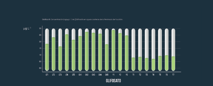 Glifosato en la Península de Yucatán El herbicida glifosato [N-(fosfonometil) glicina] se clasifica como herbicida no selectivo, sistémico y post-emergente, es el más vendido en todo el mundo en diferentes formulaciones, producidas por distintas empresas de plaguicidas. Esta sustancia es una de las más aplicadas en el país, sin embargo, como hemos mencionado anteriormente, no hay datos estadísticos sobre su uso, debido a la falta de regulación. La utilización de esta sustancia se acentúa en los cultivos transgénicos, como la soya, en el caso de la Península de Yucatán, donde se siembra este tipo de semilla que está modificada genéticamente para resistir la aplicación del glifosato y a lo largo de su cultivo se le aplica indiscriminadamente por esta razón. Sin embargo, aun cuando en los transgénicos su uso es excesivo (ya que la mayoría son resistentes a esta sustancia), es de gran relevancia mencionar que en los cultivos convencionales de soya, maíz y otros, el glifosato es aplicado sin distinción. Cuando el glifosato se usa en los cultivos, además de estar en los granos, el producto puede contaminar suelos y agua de zonas riparias, tanto de cuencas agrícolas como urbanas (van Stempvoort et al., 2014)18. En algunos estudios, se han reportado inclusive residuos de glifosato en agua subterránea (Mörtl et al., 2013). En Campeche, se tiene el caso de la agricultura en el municipio de Hopelchén el cual, en los últimos años ha tenido un incremento en las hectáreas abiertas a la agricultura. The Nature Conservancy (TNC) indica que en los últimos años en la Península de Yucatán han sido deforestadas alrededor de 80 mil hectáreas anualmente, y que en el 2013, más de 38 mil hectáreas de cobertura forestal en el estado de Campeche desaparecieron. En específico, entre 2000 y 2008, Hopelchén perdió poco más de 22 mil hectáreas de selva. El uso masivo e intensivo de plaguicidas en Hopelchén en los cultivos de maíz, sorgo, jitomate, entre otros, origina la contaminación de las aguas subterráneas, ya que muchos plaguicidas tienen una vida media de varios meses, lo cual les confiere la capacidad de permanecer mucho tiempo en el ambiente. En un estudio realizado en el 2010, se mostró que existen residuos del herbicida 2,4-D en agua de pozo de algunas localidades de Campeche, incluyendo Hopelchén. Debido a que en la Península de Yucatán se tienen varias zonas de cultivo, incluyendo los transgénicos, y que además, estos compuestos de plaguicidas pueden ser arrastrados a la zona costera por medio de escurrimientos e infiltraciones por el tipo de suelo de la región, que es calcáreo, es decir, que proceden de la descomposición de la piedra caliza, por lo tanto las infiltraciones suceden de forma preocupante. En la gráfica 8, se muestran las concentraciones de glifosato determinadas en las aguas costeras de la Península de Yucatán. Debido a la falta de regulación y actualización de los documentos oficiales sobre plaguicidas, el glifosato, entre otras sustancias, no ha sido incluido en los valores de calidad del agua. Sin embargo, podemos observar que está presente en todos los sitios y que las concentraciones mayores se presentan en las aguas del estado de Yucatán, seguido del río Champotón y de la laguna de Términos. En el río Champotón, las mayores concentraciones se presentaron río arriba, donde hay mayor concentración de cultivos disminuyendo sus niveles en la desembocadura del río. En la laguna de Términos, se tienen mayores concentraciones de glifosato en las desembocaduras de los ríos Palizada y Candelaria (Panlao), cuyos cauces circundan las principales zonas de cultivo de la cuenca de los ríos mencionados. Aunque las concentraciones de glifosato en las aguas de Quinta Roo no fueron tan altas como en los demás estados (5 órdenes de magnitud), es importante resaltar que estas aguas son consideradas para actividad turística. Los residuos de glifosato presentes en las aguas de Quintana Roo pueden provenir de los campos agrícolas hacia el sur del sitio de muestreo, o de los campos de golf para el control de la mala hierba.