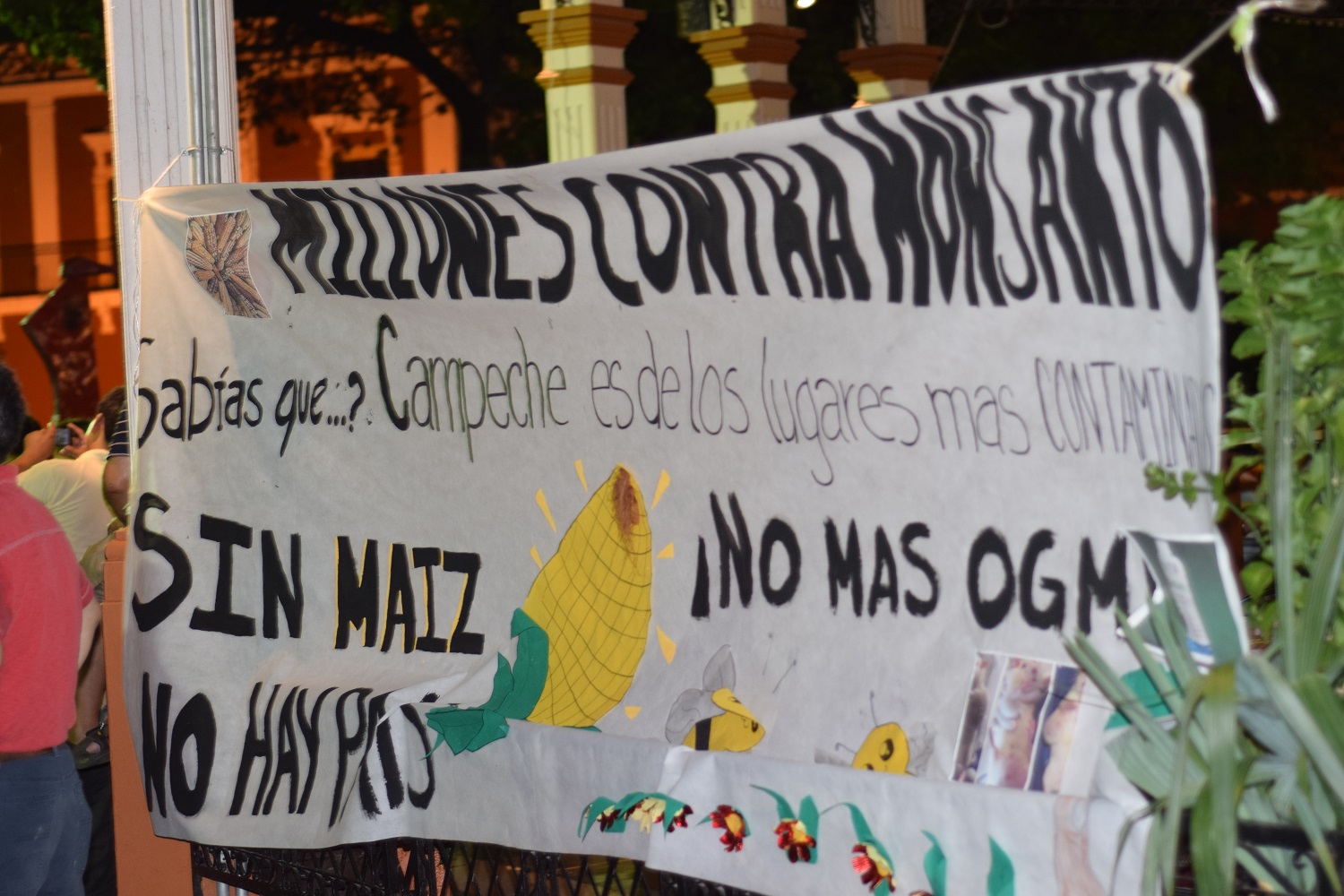Por Ronny Aguilar CAMPECHE, Cam. 21 de mayo del 2016.- Campeche se sumó a la acción mundial “Millones contra Monsanto”, con un mitin informativo para concientizar a la sociedad campechana de la problemática que ocasionan los transgénicos presentes en la Península de Yucatán y sobre todo en los territorios mayas de Hopelchén, y explicar las afectaciones de la plantación de palma africana en el sur del estado. El Colectivo Conciencia realizó la tarde de hoy un mitin informativo, en el parque principal, en el cual difundieron diversas informaciones respecto a la consecuencia de ingerir alimentos genéticamente modificados, además de las afectaciones al medio ambiente, contaminación del suelo y los ríos, así como el riesgo que existe para nuestras semillas nativas, por la mezcla de los cultivos de origen con los genéticamente modificados. Durante el mitin, también se contó con la presencia de artesanos, especialistas en la materia, activistas, cantantes urbanos y productores orgánicos. El mitin se convirtió en fiesta, gracias a los músicos urbanos que deleitaron a los presentes con su arte, que incluso, hizo bailar a una pareja presente en el foro público. Asimismo, llegaron vendedores de maíz como sustituto de café, pinole y miel, se regalaron árboles para transplantar y se dio información personalizada a quien decidía incrementar su información. Cabe señalar que la actividad “MIllones contra Monsanto” es el cuarto año que se realiza en varios países del mundo, la concentración peninsular fue en la ciudad de Mérida, Yucatán, pero Campeche también se hizo presente con este evento.