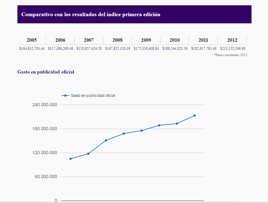 La “publicidad oficial” a detalle De septiembre a diciembre del 2009, se registraron 158 pagos, por la cantidad de 50 millones 26 mil 319 pesos, y tan solo en el mes de noviembre se pagaron 19 millones 857 mil 213 pesos. Sin embargo, el gobierno estatal informó a la organización Fundar que en todo este año, gastó 175 millones 316 mil 408 pesos en “publicidad oficial”. En el año 2010, se hicieron 685 pagos por 154 millones 126 mil 229 pesos, encontrando su pico más alto en noviembre, con 18 millones 474 mil 191 pesos. A Fundar, la administración campechana dio a conocer que erogó en total 188 millones 544 mil 23 pesos a favor de los medios de comunicación. En 2011, se realizaron 583 pagos, que repartieron la cantidad de 141 millones 870 mil 584 pesos, registrándose los egresos más altos en agosto, con 17 millones 748 mil 351 pesos. A la agrupación Fundar, el gobierno orteguista le dijo que gastó 192 millones 917 mil 783 pesos en publicidad en prensa, radio, televisión e internet. En 2012, se pagaron 158 millones 416 mil 494 pesos en 568 facturas, el pico fue en diciembre de ese año cuando se pagaron 21 millones 687 mil 796 pesos. Sin embargo, la Secretaría estatal de la Contraloría indicó que liquidó 213 millones 152 mil 506 pesos en “publicidad oficial”.