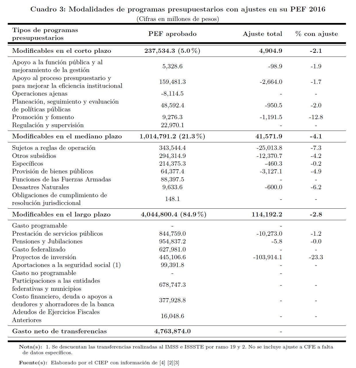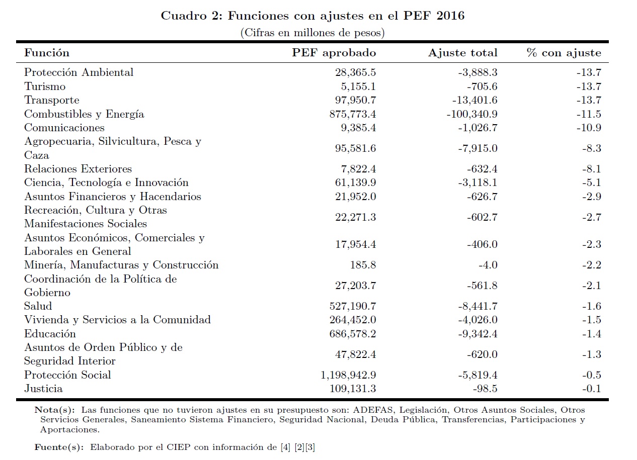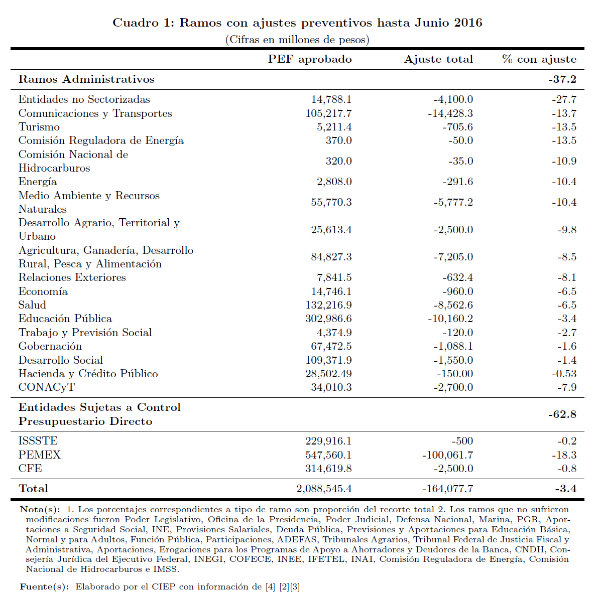 Los ajustes al gasto desde la perspectiva administrativa En el documento, el CIEP manifestó que la época de abundancia de ingresos petroleros acabó. Con la caída de los precios del petróleo y de su producción, de no existir una alternativa para una mayor recaudación, seguirá un período de ingresos austeros, con recortes en el presupuesto. “Hasta junio del presente año, el gobierno federal ha anunciado, en suma, un recorte de 164 mil 77.7 millones de pesos, lo que equivale al 3.4 por ciento del PEF para 2016. El primer ajuste preventivo al gasto del 2016 fue anunciado en febrero, por un equivalente a 132.3 mil millones en el marco del deterioro económico global. El segundo ajuste preventivo, anunciado en junio, es de 31 mil 714.7 millones adicionales, en el marco de la salida del Reino Unido de la Unión Europea. Según los precriterios de política económica, para 2017, se requerirá otro ajuste de 175 mil 100 millones de pesos”, detalló. “Un primer acercamiento, hacia los sectores afectados, se observa en los recortes a las Secretarías responsables de cada ramo. Sumando los ajustes publicados en febrero y en junio, del presente año, las entidades más afectadas, como proporción de su presupuesto total aprobado son: las Entidades no Sectorizadas, con una disminución del 27.7 por ciento; Pemex -18.3 por ciento, Comunicaciones y Transportes -13.7 por ciento y Turismo -13.5 por ciento. “Por otro lado, existen ramos, dependientes del gobierno federal, que no han sido afectados por los recortes. Entre estos ramos se encuentran los encargados de velar por la seguridad del país: Defensa, Marina, Procuraduría General de la República y el Poder Judicial, además de, Función Pública, Tribunales Agrarios y la Consejería Jurídica del Ejecutivo Federal. “Los ajustes previstos se han centrado en el presupuesto que depende directamente del Poder Ejecutivo (los ramos administrativos). Sin embargo, éste sólo suma el 21.2 por ciento del total del presupuesto aprobado. Para llevar a cabo una revisión completa del presupuesto público, es indispensable abordar los presupuestos asignados a otros rubros, como lo son los ramos autónomos (ninguno sufrió modificaciones), los ramos generales (que forman parte del gasto no programable, que a su vez implican una presión a las finanzas públicas, el Tribunal Federal de Justicia Fiscal y Administrativa, el ramo de Información Nacional Estadística y Geográfica y el Instituto Mexicano del Seguro Social, los cuales no disminuyeron su presupuesto, según lo publicado por la SHCP.