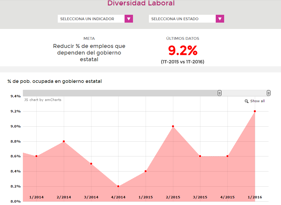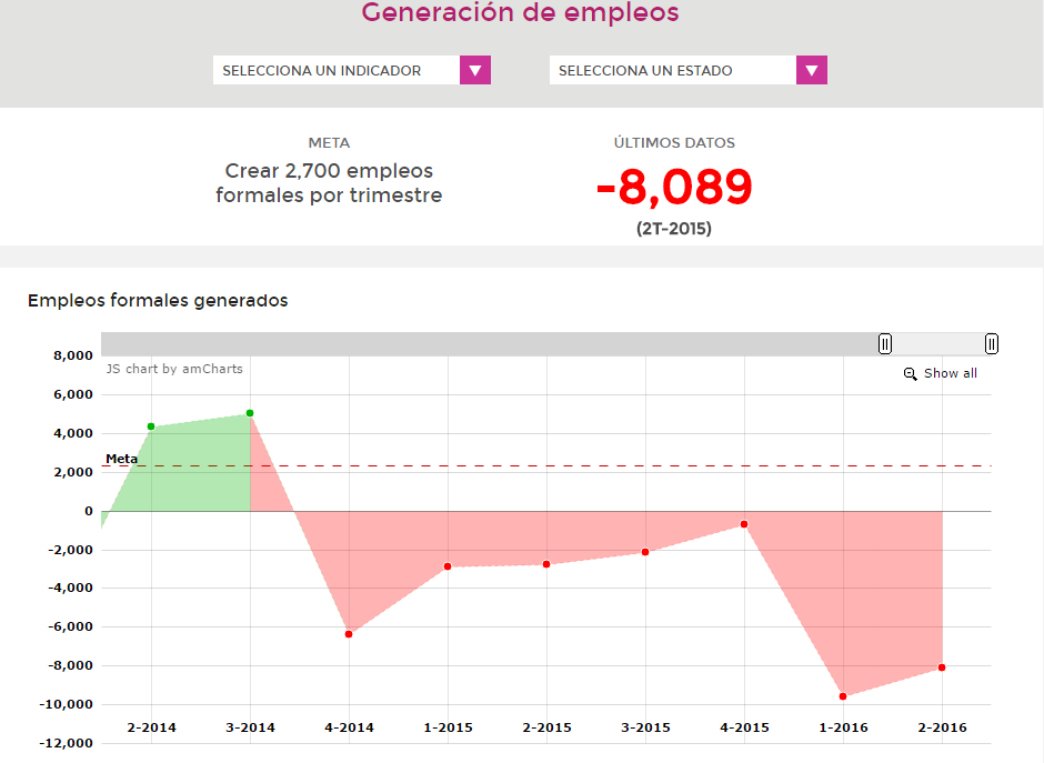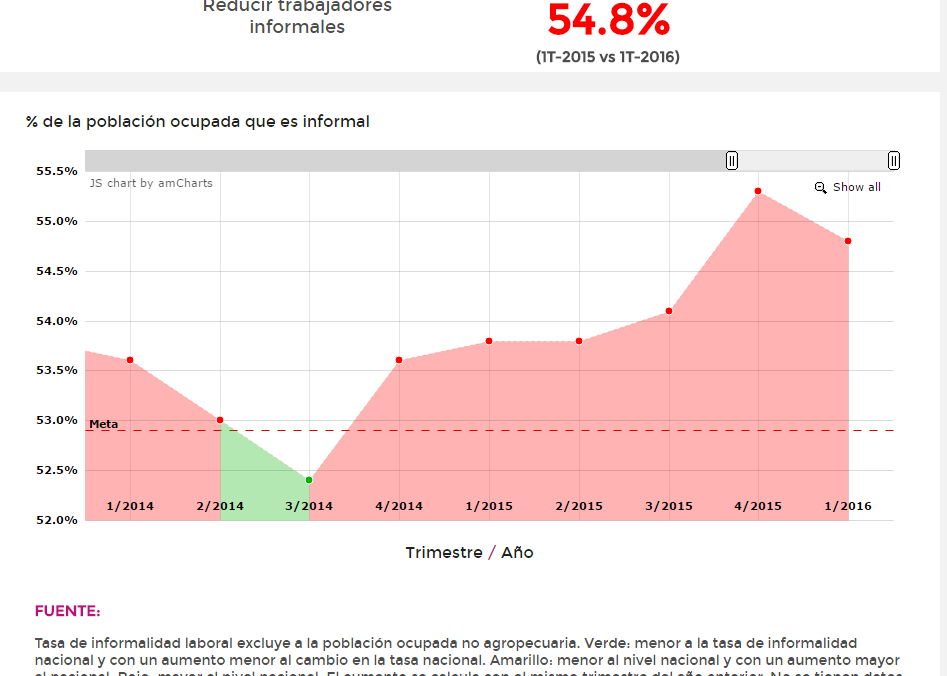 11em El Programa de Reactivación Económica, promocionado por el ilegítimo Alejandro Moreno como la solución a los problemas del estado, el empleo no levanta y en el segundo trimestre del 2016, se perdieron otros 8,089. Ya suman 20,579 desde su llegada. Por Daniel Sánchez CAMPECHE, Cam. 11 de julio del 2016.- Pese al Programa de Reactivación Económica, promocionado por el ilegítimo y espurio Alejandro Moreno Cárdenas como la solución a los problemas económicos de Campeche, el empleo no levanta y se profundiza su pérdida en el estado, al acumular ocho mil 89 menos en el segundo trimestre del año. En contraste, los puestos de trabajo en el gobierno del Estado siguen aumentando y ahora representan el 9.2 por ciento de los trabajadores ocupados en la entidad, mientras que la informalidad también se incrementa a 54.8 por ciento, pese a las campañas desatadas por Moreno Cárdenas contra quienes se dedican al comercio ambulante, semifijo y fijo en el Centro Histórico y las principales avenidas y parques de la capital campechana. La organización civil México ¿Cómo Vamos? publicó, basada en cifras oficiales del Instituto Mexicano del Seguro Social, sus actualizaciones al Semáforo Económico Estatal de Campeche, en el que revela que este es el séptimo trimestre que no se producen empleos, al contrario, se pierden puestos de trabajo en la entidad. Campeche tiene asignada una meta de generar dos mil 500 empleos trimestrales, pero desde el tercer trimestre del 2014, cuando produjo cinco mil 42, ha registrado pérdidas. En el cuarto trimestre del 2014, fueron seis mil 385; en el primero del 2015, dos mil 904; en el segundo del 2015, dos mil 791; en el tercero del 2015, dos mil 167; en el cuarto del 2015, 714; en el primero del 2016, nueve mil 609, y en el segundo del 2016, ocho mil 89. Así, en un año y nueve meses, el estado perdió 32 ml 659 puestos de trabajo y en los cuatro trimestres que le ha tocado a Alejandro Moreno, 20 mil 579 personas se quedaron sin empleos. La agrupación precisó que “la generación de empleo es el número de puestos de trabajo nuevos creados en el estado, que otorgan seguridad social a sus empleados (pensión de jubilación y acceso a servicios de salud)” y es el que “otorga a los individuos mayor certeza sobre su situación laboral y está correlacionado con niveles más altos de productividad”. 11em1 Tasa de informalidad laboral En cuanto a la tasa de informalidad laboral, que excluye a la población ocupada no agropecuaria, Campeche tiene la meta de reducir los trabajadores informales, pero no lo ha logrado, ya que en el primer trimestre del 2016, representaron el 54.8 por ciento. Este indicador viene creciendo desde el primer trimestre del 2014, a la par que la caída del empleo formal. “Informalidad es el porcentaje de la población ocupada que no cuenta con seguridad social, porque la unidad económica para la que trabaja no reconoce ese vínculo laboral”, aclaró México ¿CómoVamos?. “La informalidad se correlaciona con la baja productividad y el bajo crecimiento, porque no permite que las empresas crezcan a su máxima capacidad, ya que éstas tratan de permanecer ocultas para no hacer frente a sus obligaciones fiscales. En la informalidad, no hay acceso al crédito, lo cual no permite reinvertir para crecer y con ello contribuir al desarrollo económico”, apuntó. 11em2 Población ocupada en el gobierno estatal Sobre el porcentaje de la población ocupada que labora en el gobierno estatal, que excluye a trabajadores de hospitales, educación y del gobierno federal, Campeche tiene como meta reducir el porcentaje de empleos que dependen del gobierno estatal. Para el primer trimestre del 2016, este indicador marcó el 9.2 por ciento, 0.6 puntos porcentuales más que en el cuatro trimestre del 2015, y viene creciendo desde el segundo trimestre del 2015.