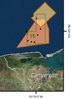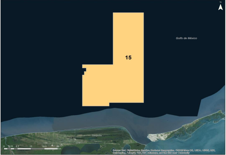 El área 15 corresponde a la provincia petrolera de las Cuencas del Sureste, específicamente en la provincia geológica Macuspana, donde ya se han perforado siete pozos, algunos con producción de gas y condensados, y está cubierto por dos estudios sismológicos tridimensionales (3D), denominados Macuspana y Takín. Los recursos prospectivos estimados en este bloque van desde los 15.3 millones de barriles de petróleo crudo equivalente, en el P90 (probabilidad del 90 por ciento), pasando por el P50, estimado en 81.7 millones; Medios, de 158.8 millones; P10, de 410.4 millones, y ajustado por riesgos, de 28.1 millones de barriles de petróleo crudo equivalente.