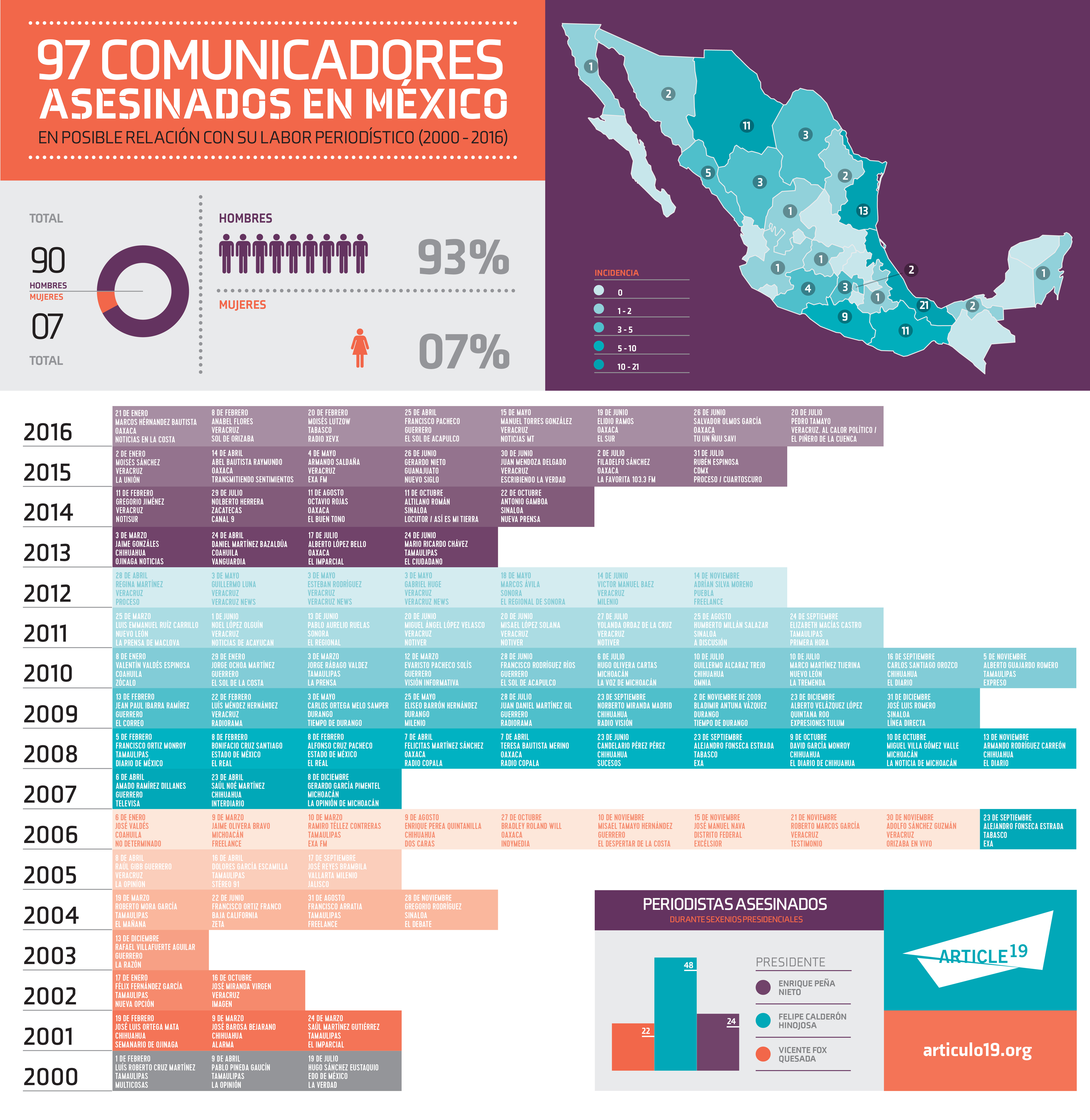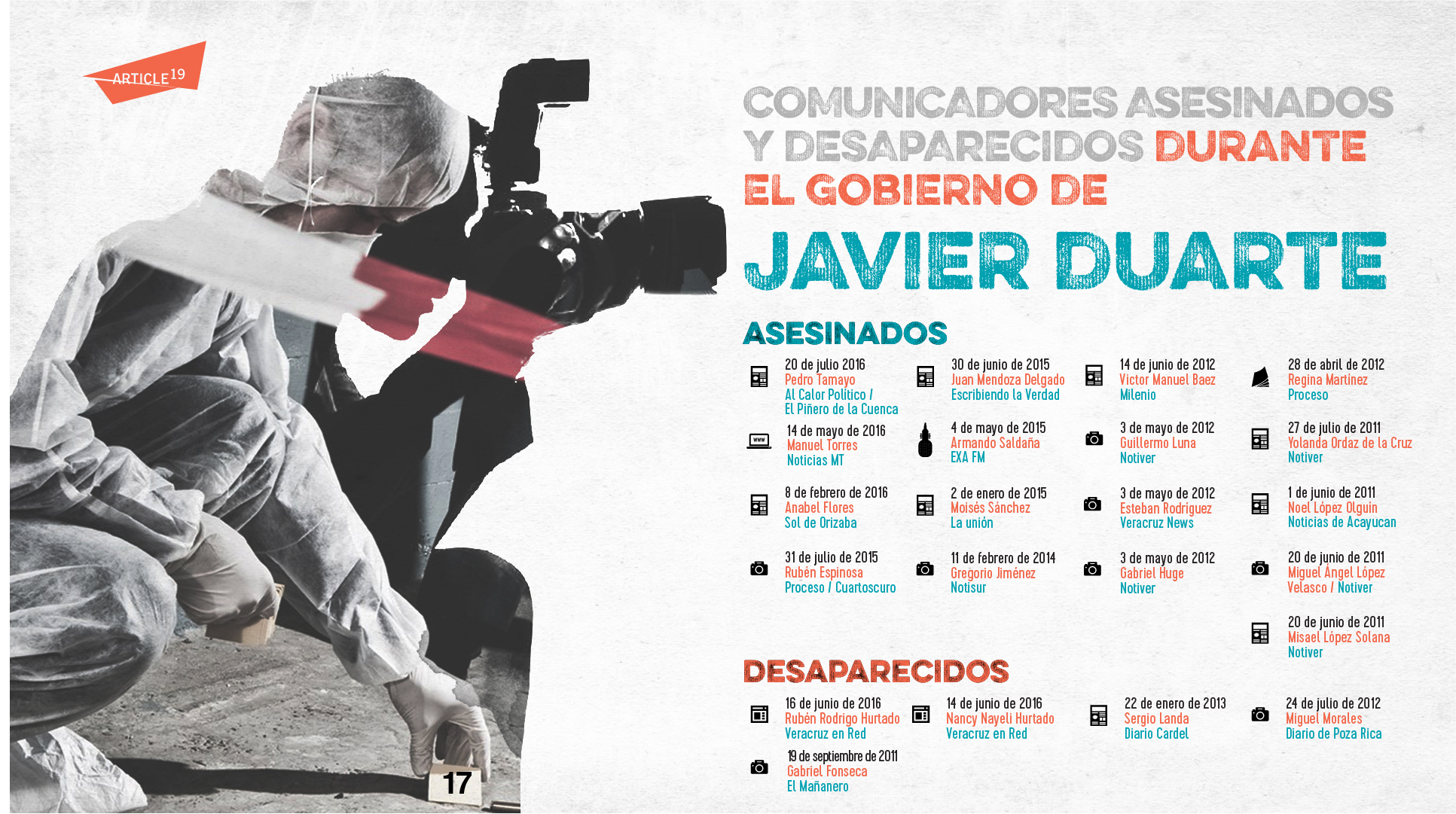 Es importante destacar que no es el primer asesinato de un periodista que se registra en esta región fronteriza entre los estados de Veracruz y Oaxaca. El 4 de mayo de 2015, fue encontrado el cuerpo del periodista Armando Saldaña Morales, residente de Tezonapa, Veracruz, con heridas por impacto de bala y signos de tortura, en Cosolapa, Oaxaca, municipio. Armando trabajaba en el área de noticias de la estación Ke Buena 100.9 F.M. en Tierra Blanca; junto a su cuerpo se encontraron los gafetes de esta estación. En el mismo municipio, el 11 de agosto de 2012, Octavio Rojas Hernández, corresponsal del periódico El Buen Tono, fue asesinado cuando se encontraba en su domicilio. Es de especial preocupación el número de agresiones cometidas contra periodistas de Veracruz, tomando especial vigencia el número de homicidios ocurridos en la actual administración del gobernador Javier Duarte, un total de 17 documentados por Artículo 19. Esto es indicativo de la creciente e imparable ola de violencia contra la prensa en aquel estado. Este patrón alarmante demuestra la ineficiencia de las instituciones locales tales como Fiscalía General de Veracruz, la Comisión Estatal para la Atención y Protección de los Periodistas (CEAPP) Veracruz y las corporaciones municipales de seguridad pública. En este mismo sentido, las autoridades federales, como la Fiscalía Especializada para la Atención de Delitos cometidos contra la Libertad de Expresión (FEADLE) y el Mecanismo de Protección a Personas Defensoras de Derechos Humanos y Periodistas, pese al convenio de colaboración signado en noviembre de 2015 con sus homólogas estatales (Alerta Veracruz), no han podido revertir la situación imperante, generando con ello mayor impunidad y por ende la repetición frecuente de las agresiones en contra de la prensa. El asesinato de Tamayo ocurre a una semana del aniversario luctuoso del fotoperiodista Rúben Espinosa, quien el 31 de julio de 2015 fuera asesinado, junto con cuatro personas más, en la Ciudad de México, luego de huir de Veracruz por las constantes amenazas de muerte en su contra. Artículo 19 exigió a la Fiscalía General de Veracruz una pronta investigación del asesinato de Pedro Tamayo Rosas, tomando como prioritaria su labor periodística en las pesquisas a realizar, más aún con los antecedentes de violencia en su contra, mismos que fueron puestos de conocimiento de las autoridades encargadas de salvaguardar la integridad del periodista en enero pasado. Asimismo, recordó que es obligación constitucional de la Fiscalía Especial para la Atención de Delitos cometidos en contra de la Libertad de Expresión (FEADLE), de la Procuraduría General de la República (PGR), atraer los casos tratándose de delitos graves en contextos donde se tiene elementos objetivos para determinar que existen condiciones adversas para el ejercicio de la libertad de expresión, como en el estado de Veracruz. La organización demandó a las autoridades locales y federales, asegurar la protección real a los periodistas y no utilizar las medidas otorgadas como un medio político para sustraerse de las obligaciones generales del Estado. La protección en caso de amenazas y otras agresiones graves no se limita a tomar medidas reactivas como protección policiaca o instalación de infraestructura, sino que se debe comprender como un continuum de acciones integrales que entrañan la debida diligencia en la investigación de estos hechos y la consecuente identificación, enjuiciamiento y sanción de los responsables. En el caso de Tamayo, es incuestionable que la impunidad prevaleciente frente a los sujetos que lo amenazaron abrió la posibilidad de su asesinato. En este sentido, y debido a la alternancia política que vivirá el estado de Veracruz a partir de 1 de diciembre de este año, la agrupación exigió al gobernador electo, Miguel Ángel Yunes Linares,q ue incluya dentro de su agenda política, como tema prioritario, todas las medidas necesarias para la protección y promoción del derecho a la libertad de expresión e información, a fin de garantizar la prevención, investigación y sanción de toda violación de los derechos reconocidos por la Constitución y los Tratados Internacionales de los que el Estado Mexicano sea parte.