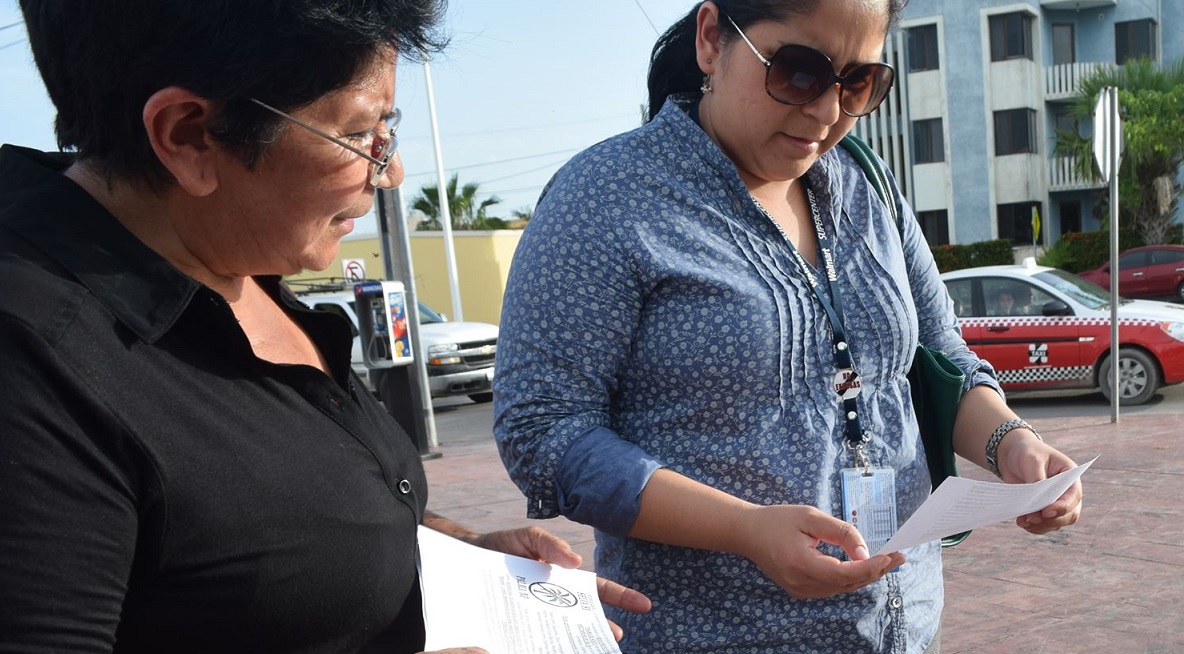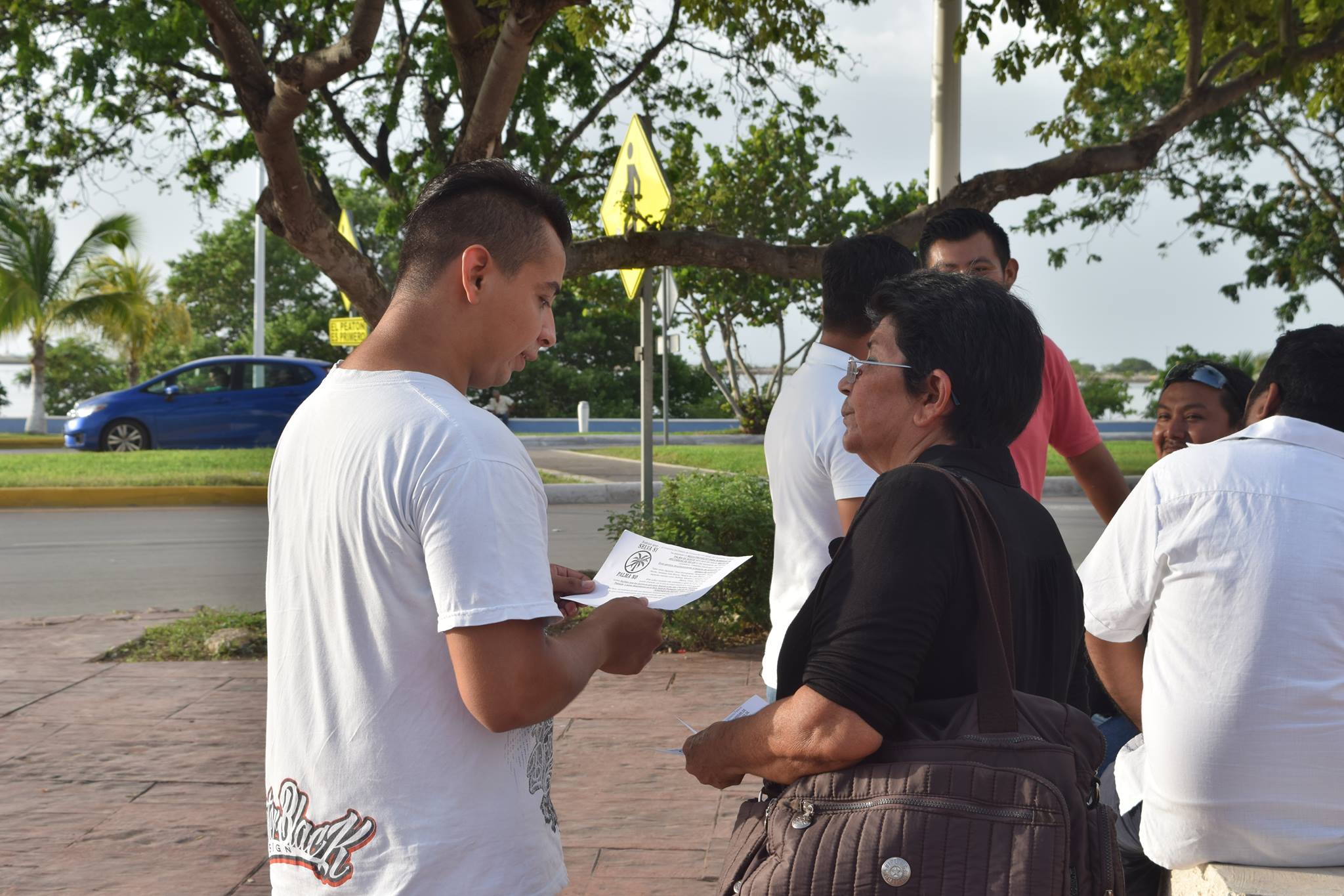 Exhiben lona, reparten volantes y pegan calcomanías en alrededores del parque de la Novia del Mar, para hacer conciencia entre los campechanos sobre la destrucción ambiental que acarrea este monocultivo en el sur del estado.
