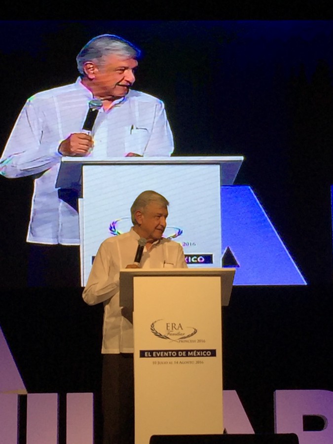 Hacer realidad el Estado de Bienestar La quinta gran idea, señaló es hacer realidad el Estado de Bienestar, es obvio que primero debe crearse la riqueza y luego distribuirse. No puede repartirse lo que no se tiene. “Vuelvo a proclamar: por convicción, humanismo y por el bien de todos, primero los pobres. Solo con una sociedad justa lograremos el renacimiento de México. El país no será viable si persisten la pobreza y la desigualdad. Es un imperativo ético, pero no solo eso, sin justicia no hay garantía de seguridad, ni de tranquilidad ni de paz social”, comentó. Admitió que el Estado –en cualquier parte del mundo – es fundamental para el bienestar de la población y, en un país como México con tantas desigualdades, resulta indispensable para la supervivencia de muchos. “Al Estado le corresponde atemperar las desigualdades sociales. No es posible seguir desplazando a la justicia social de la agenda de gobierno”. Reiteró que el Estado debe alentar con decisión el desarrollo social en dos vertientes: por un lado, impulsar el crecimiento económico y la creación de empleos para mejorar los ingresos de la gente. Ello redundará en mejor educación, salud y calidad de la vida en general. Por otro lado, abundó, en tanto se logra alcanzar ese nivel de desarrollo, y dada la situación de pobreza en que vive la mayoría de los mexicanos, el Estado debe garantizar satisfactores básicos de bienestar. Anunció que su propuesta “consiste en establecer un Estado de Bienestar, igualitario y fraterno, para garantizar que los pobres, los débiles y los olvidados encuentren protección ante incertidumbres económicas, desigualdades sociales, desventajas y otras calamidades, donde todos podamos vivir sin angustias ni temores”. Sociedad segura con atención a los jóvenes El sexto planteamiento, describió, consiste en Sociedad segura y enfatizó: la actual situación de inseguridad y violencia es producto, en buena medida, de la desatención a los jóvenes, a los que se les ha cancelado el futuro, pues no han tenido oportunidades de trabajo o de estudio, y solo les han dejado el camino de las conductas antisociales. “Sin embargo, los gobiernos neoliberales y las élites del poder ni siquiera aceptan que la pobreza y la falta de oportunidades de empleo y bienestar originaron el presente estallido de odio y resentimiento. Y, como es obvio, tampoco les importa atender las causas del problema. Por el contrario, en una especie de enajenación autoritaria, pretenden resolverlo con medidas coercitivas, enfrentando la violencia con la violencia”, alertó. Andrés Manuel López Obrador sostuvo que la solución de fondo, la más eficaz, pasa por enfrentar el desempleo, la pobreza, la desintegración familiar y la pérdida de valores y por la incorporación de los jóvenes al trabajo y al estudio. “Además de atender las causas de fondo es necesario llevar a la práctica lo siguiente: no permitir la corrupción en corporaciones policiacas o militares, en ministerios públicos, juzgados y en otras instancias de seguridad pública y de procuración de justicia; mayor profesionalismo para el combate a la delincuencia, porque se trata de inteligencia, no de fuerza; así como de mucha coordinación y perseverancia”, indicó. Hacer posible una república amorosa Ante los asistentes, anunció la séptima gran idea: hacer posible una república amorosa, ya que la decadencia que se padece es producto tanto por la falta de oportunidades de empleo, estudio y otros satisfactores básicos, como por la pérdida de valores culturales, morales y espirituales. “Por eso mi propuesta para lograr el renacimiento de México tiene el propósito de hacer realidad el progreso con justicia y, al mismo tiempo, auspiciar una manera de vivir sustentada en el amor a la familia, al prójimo, a la naturaleza, a la patria y a la humanidad”, abundó. Explicó que cuando habla de una república amorosa, con dimensión social y grandeza espiritual propone regenerar la vida pública de México mediante una nueva forma de hacer política, aplicando en prudente armonía tres ideas rectoras: la honestidad, la justicia y el amor. Honestidad y justicia para mejorar las condiciones de vida y alcanzar la tranquilidad y la paz pública; y el amor para promover el bien y lograr la felicidad, concluyó. Peña provocó el conflicto magisterial con la Reforma Educativa En la sesión de preguntas y respuestas, Andrés Manuel evitó opinar sobre los candidatos Donald Trump y Hilary a la presidencia de Estados Unidos, porque no quiere que después ellos opinen sobre las elecciones del 2018. “Si me meto, luego van a opinar y es mejor que mantengamos el principio de la no intervención, y de la autodeterminación de los pueblos”, aseveró. Pidió no dejarse llevar por las apariencias, porque siempre en procesos electorales se exagera, hay  excepciones, pero en todas las partes del mundo se finge, no se actúa con autenticidad, hay quienes dicen que en el flanco izquierdo se debe de actuar pensando en tomar el violín con la izquierda para tocarlo con la derecha, pero también puede ser al revés. En otro tema, dijo que Morena tiene que ganar la Presidencia de la República, pero también la mayoría en el Congreso de la Unión para lograr que se cumplan los beneficios de la gente. Al preguntar los asistentes sobre la opinión de las acciones que ha llevado a cabo los integrantes de la CNTE en su lucha para derogar la Reforma Educativa, López Obrador contestó que nadie protesta por gusto, si se atiende el problema, no se afecta a terceros y señaló que el gobierno de Peña fue quien provocó el conflicto con los maestros por la llamada Reforma Educativa. La reforma educativa es un mecanismo para someter al magisterio, además es una recomendación de los organismos financieros internacionales, afirmó al preguntar ¿qué si es sensato hablar de una reforma educativa sin la participación de los maestros? Manifestó que