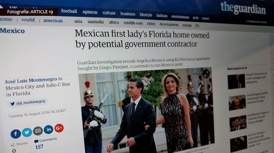 El nueve de agosto, The Guardian publicó una investigación periodística de Montenegro, en la que expone un posible conflicto de interés, en el que se involucran la Presidencia de México, encabezada por el presidente Enrique Peña Nieto, y el empresario Ricardo Pierdant. En 2014, la empresa Biscayne Ocean Holdings LLC, propiedad de Pierdant, pagó la suma de 29 mil 703.82 dólares por concepto de impuesto predial por un departamento ubicado en Miami, Florida, propiedad de la primera dama. De acuerdo con las fuentes citadas por Montenegro, Grupo Pierdant es una empresa que podría concursar en el gobierno federal por la construcción de puertos marítimos. La agrupación reiteró que la búsqueda, publicación y difusión de información que revelan posibles actos de tráfico de influencias, conflicto de interés y/o corrupción por parte de autoridades, debido al interés público que genera, es un discurso especialmente protegido por el derecho a la libertad de expresión y no debe estar sujeta a mecanismos de censura directa o indirecta, como lo han sido las amenazas, ataques cibernéticos, inicios de procesos legales y actos intimidatorios en contra de periodistas y medios de comunicación. En marzo de 2015, Artículo 19 se pronunció acerca de los continuos ataques contra la periodista Carmen Aristegui y su equipo de investigación, luego de la publicación del reportaje “La casa blanca de Enrique Peña Nieto“. Un año después, en junio, documentó el inicio de un proceso legal por daño moral por parte de la empresa MVS Radio en contra de la comunicadora y de la editorial Penguin Random House, a causa del supuesto perjuicio ocasionado a partir del prólogo del libro del mismo nombre. En este contexto, los actos desplegados contra Montenegro se enmarcan en la respuesta especialmente virulenta contras las y los periodistas que revelan posibles actos de corrupción por parte de las autoridades de más alto nivel en México. Debido a ello, la organización urgió a las autoridades a garantizar la labor periodística de quienes investigan y revelan presuntos actos de corrupción de funcionarios públicos y el derecho de la sociedad a estar informada, especialmente sobre temas de carácter público. Artículo 19 exigió a las autoridades federales a llevar a cabo las medidas necesarias para salvaguardar la integridad del periodista.