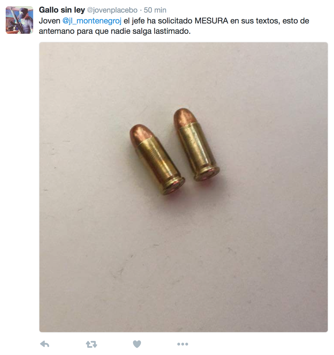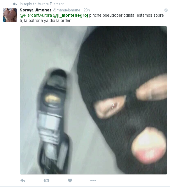 Montenegro recibió otra amenaza el 15 de agosto, esta vez por parte del usuario @manuelpmane, quien le envió una imagen de una persona con pasamontañas y una pistola en la mano: “@jl_montenegroj pinche pseudoperiodista. Estamos sobre ti, la patrona ya dio la orden (sic)”.