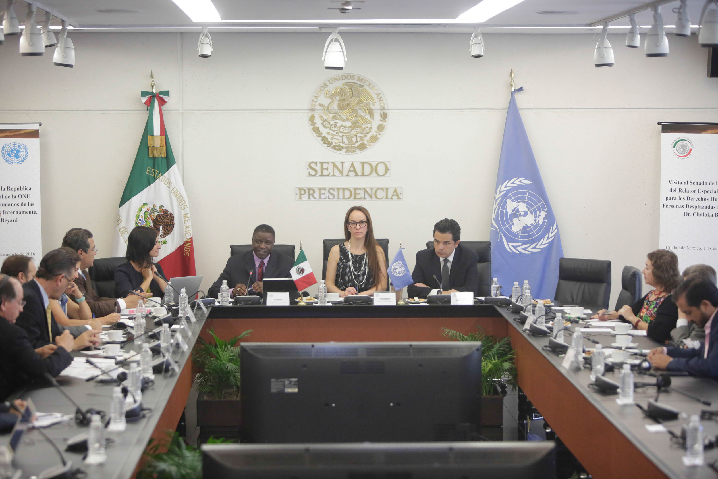 Se reúnen senadores con el relator de la ONU para Derechos los Humanos de las Personas Desplazadas Internamente, doctor Chaloka Beyani/ONU coadyuvará a brindar soluciones al problema de desplazamiento interno: relator.  CIUDAD DE MEXICO, D.F. 21 de agosto del 2016.- Senadores y organizaciones de la sociedad civil consideraron que en México el problema del desplazamiento interno no se ha visualizado en la agenda nacional, situación que ha dejado en la invisibilidad a miles de personas, y por lo cual es urgente legislar en esta materia y generar políticas públicas para atender esta problemática.  En reunión de trabajo con el relator de la ONU para Derechos los Humanos de las Personas Desplazadas Internamente, doctor Chaloka Beyani, la senadora Gabriela Cuevas Barrón, presidenta de la Comisión de Relaciones Exteriores, consideró que sobre este fenómeno, México “está dejando invisibles a sus ciudadanos”.  Son muchas las causales las que motivan el desplazamiento forzado de personas, y si no nos metemos a fondo a ver cuáles son las causas, “cerrar los ojos no nos va a hacer mejores políticos, no va a hacer mejores leyes y mucho menos va a generar políticas públicas”.  Consideró que en tanto no logremos que la problemática que vive México en materia de derechos humanos se convierta en una causa para todos: gobierno, legisladores, sociedad, instituciones, difícilmente saldremos de la terrible coyuntura en la que nos encontramos.  “Es urgente una legislación que atienda a miles de mexicanos que, por causas desde fenómenos naturales, problema religiosos, crisis económicas, violencia, se ven forzados a dejar sus hogares, sus comunidades”, indicó la senadora del PAN.  En tanto, el senador Zoé Robledo Aburto, del PRD, también consideró que es urgente “visibilizar” el tema en nuestro país, pues hay quienes insisten en que las cosas que no se pronuncian, no se debaten y desaparecen por decreto; “se equivocan, porque hay desplazados internos en México”.  Explicó que Chiapas es un estado que ha sufrido del problema del desplazamiento por diferentes causalidades: conflictos religiosos, problemas agrarios, cuestiones étnicas, pero hoy existen condiciones objetivas innegables que demuestran la presencia del fenómeno de desplazamiento interno y por lo mismo se requieren protocolos de actuación, leyes nacionales para prevenirlo, atenderlo y encontrarle soluciones duraderas.  “Es un tema urgente por más que el Ejecutivo federal y otros actores políticos de nuestro país piensen lo contrario. Los más de 280 mil desplazados que contabilizó el Centro de Monitoreo de Desplazamiento Interno del Consejo Noruego para Refugiados en México, son de carne y hueso, existen, están ahí, es una población que además está creciendo y está desamparada del marco jurídico mexicano”, señaló.  El senador Enrique Burgos García, presidente de la Comisión de Puntos Constitucionales, dijo que el desplazamiento es un fenómeno al que no somos ajenos al interior del país. Nos interesa a todos encontrar opciones y creo que lo primero es reconocer en dónde tenemos déficit o en dónde tenemos, por el contrario, áreas de oportunidad.  Señaló que una vez que la reforma constitucional en la materia aprobada en México entró en vigor, ahora hay que trabajar en la legislación secundaria, porque el sistema constitucional mexicano establece los principios fundamentales para lograrlo.  A ello habremos de abocarnos a la brevedad para darle el complemento y sobre todo la efectividad, indicó el senador Enrique Burgos.  Por su parte, el senador Manuel Cárdenas Fonseca, destacó que la visita del relator especial de Naciones Unidas debe representar el “tiempo idóneo para seguir tratando y abordar el tema, reconociéndonos en el problema y reconociéndonos en nuestras capacidades para poderlo solucionar”.  En este sentido, agregó que deben existir en el país estadísticas y fuentes confiables sobre el número de desplazados a nivel nacional, porque existen cifras bastante dispares. “Hago votos para que de manera pronta, a partir de acuerdos mínimos, podamos ver un encuentro oficial entre el Gobierno de la República y la representación que usted tiene de Naciones Unidas”.  Es responsabilidad del Estado proteger a sus ciudadanos: Relatos de la ONU  Al respecto, el relator de la ONU para Derechos los Humanos de las Personas Desplazadas Internamente, doctor Chaloka Beyani, dijo que en un sistema de protección es responsabilidad del Estado de proteger a sus ciudadanos y en esta tarea, Naciones Unidas está dispuesta a cooperar a través de recomendaciones.  Explicó que el objetivo de su visita es dialogar con las autoridades y coadyuvar para tratar de solucionar los  problemas  que enfrentan en materia de desplazamiento interno.  Indicó que en esta región, el desplazamiento es un fenómeno particular que sólo afecta a aquellos que son desplazados, sino que es una cuestión que tiene que ver con los estados. “Si no solucionan las necesidades de la población entonces las consecuencias en los estados se empieza a sentir de diversas maneras”.  Agregó que el problema requiere una respuesta internacional y nacional efectiva, el reconocimiento es el primer paso, pero a veces cuando no lo hay es obvio que el problema existe, como lo demostró el reporte de la Comisión Nacional de Derechos Humanos de México, en mayo de este año.  El relator de Naciones Unidas dijo que en el contexto de lo que ha sucedido en la región, debe haber un enfoque regional, no sólo nacional, y en la implementación de políticas públicas y legislaciones enfocadas a este tipo de personas, debe contar con las características y problemáticas de cada país.  El doctor Edgar Corzo, Quinto Visitador de la Comisión Nacional de Derechos Humanos, señaló que para esa institución es necesario reconocer que en México existe el desplazamiento interno, a fin de tomar las acciones co