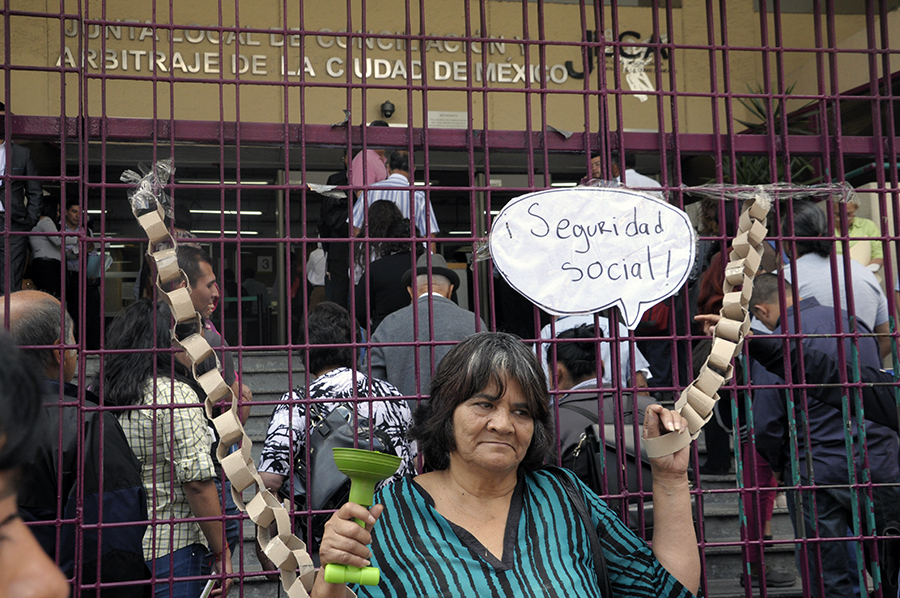 Ex trabajadoras del IEMS encadenadas simbólicamente en JLCyA/CIMACFoto: Gema Villela Valenzuela Por Gema Villela Valenzuela Cimacnoticias CIUDAD DE MEXICO, 20 de septiembre del 2016.- Trabajadoras del Instituto de Educación Media Superior (IEMS) realizaron un acto de protesta afuera de la Junta Local de Conciliación y Arbitraje (JLCyA) para exigir se vigile la audiencia que tendrán el 21 de septiembre. Con limpiavidrios y pancartas en mano, las 65 trabajadoras de intendencia que fueron despedidas injustificadamente del IEMS, se encadenaron de manera simbólica a las puertas de la entrada de la JLCyA para exigir se vigile la audiencia en la que demostrarán que sí trabajaron para el gobierno capitalino y no para empresas de outsourcing. Ya pasaron nueve meses desde que el IEMS las despidió de manera injustificada, durante ese tiempo, algunas de ellas han buscado trabajo en otros lugares pero tienen dificultades para conseguirlo por su edad y por dedicar su tiempo a la defensa de sus derechos laborales, ya que todas tienen un rango de edad de 55 años a más. Tal es el caso de Gloria Olmos Gaona, una mujer de 61 años de edad, viuda y que vive con su hija, quien dijo a Cimacnoticias que conseguir trabajo ha sido difícil porque dar seguimiento a una denuncia requiere de tiempo, explicó que ese fue el motivo por el cual perdió un empleo que había conseguido después haber sido despedida injustificadamente del IEMS, en donde laboró durante siete años. Patricia Márquez Martínez de 55 años de edad, al ver que ya no la contrataban por su edad, empezó a vender dulces y comida al personal docente del IEMS, para poder obtener un ingreso.