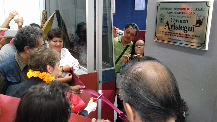Al recibir la presea, Carmen Aristegui la dedicó a sus compañeros periodistas que han sido perseguidos, desaparecidos censurados y asesinados | Foto: Guadalupe Cabañas La periodista Carmen Aristegui cortó el listón de la cabina de radio ubicada en las instalaciones de Radio Universidad, misma que llevará su nombre, por lo que dijo sentirse emocionada y agradecida por el recibimiento de la ciudadanía de Chilpancingo. “Gracias por esta cabina, el honor inmenso de que hayan tenido la iniciativa de poner este nombre, porque entiendo que es la forma que tienen para hacer valer la labor del periodismo, lo que significa la prensa libre y un periodismo crítico”. “Estamos a unas horas del aniversario de la desaparición de los 43 estudiantes de Ayotzinapa, de su desaparición que ha marcado la vida de Guerrero”. Al recibir la presea, Carmen Aristegui la dedicó a sus compañeros periodistas que han sido perseguidos, desaparecidos censurados y asesinados, porque México, dijo, se ha convertido trágicamente en uno de los países que tiene mayor riesgo de ejercer la labor periodística, y una democracia y un país libre no puede serlo sin contar con un ejercicio crítico e independiente”. “Quiero dedicar esta presea popular a mis compañeros desaparecidos, censurados y asesinados en México, quiero decirles que esta batalla que podemos dar como lo hacemos en este encuentro es una batalla por todos nosotros y hay que seguirla dando, que este reconocimiento popular lo dedico a ellos y lo dedico desde luego a quienes están aquí, a estas familias, padres, madres, hermanos, amigos de los jóvenes de Ayotzinapa”, agregó. Finalmente, la periodista pidió que se continúe exigiendo al Estado mexicano la presentación con vida de los normalistas y que cumpla con su mandato de impartir justicia.
