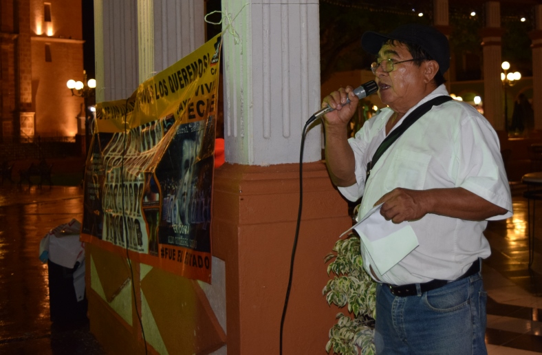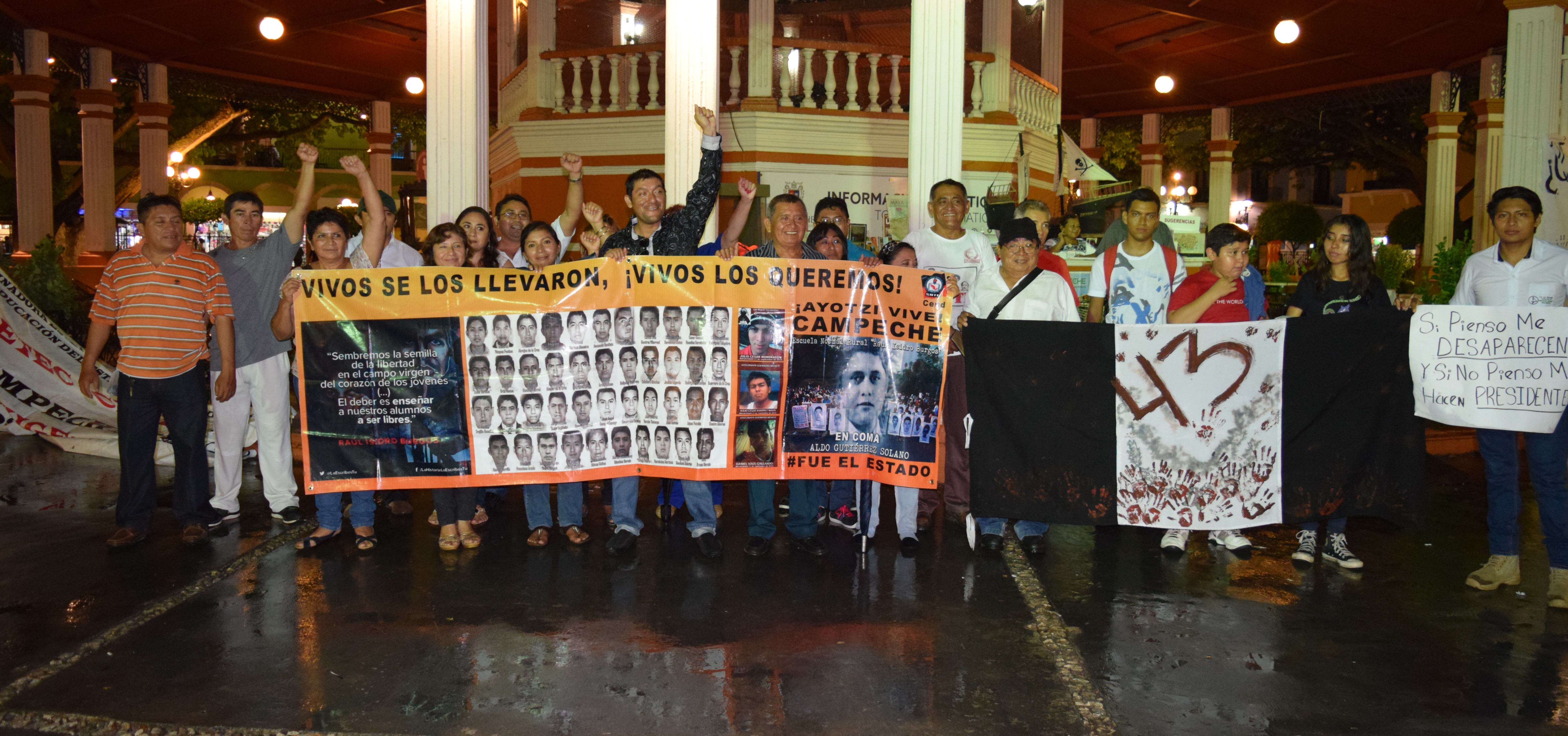 Por Ronny Aguilar CAMPECHE, Cam. 26 de septiembre del 2016.- En Campeche, organizaciones magisteriales, de la sociedad civil y de jubilados y pensionados recordaron la desaparición forzada de los 43 estudiantes de la Escuela Normal Rural “Raúl Isidro Burgos”, de Ayotzinapa, Guerrero, y una vez más, exigieron justicia, la renuncia de Enrique Peña Nieto y la abrogación de las reformas estructurales. Ni la lluvia detuvo a las decenas de ciudadanos campechanos que, con determinación y convicción, protestaron y alzaron la voz para exigir justicia por los 43 normalistas desaparecidos, en un mitin realizado en el parque principal, con lo que Campeche su sumó a las demás entidades del país y el mundo que realizaron actos de inconformidad ante las acciones viles del gobierno mexicano. La exigencia de renuncia de Peña Nieto, la abrogación de las reformas y el alto a la represión del Estado fueron los ejes centrales de los discursos del día de hoy, sin pasar por alto la exigencia de la disidencia para que se reinstale a los maestros cesados por la reforma mal llamada educativa enel estado. Carmen Duarte, representante de los jubilados y pensionados, así como de los Maestros Democráticos, señaló que este día se recuerda la masacre del Estado contra nuestros jóvenes, hijos, maestros y hermanos, recordó el ya me cansé del ex procurador Jesús Murillo Karam, la mentira histórica de Peña Neto, las corrupciones y los asesinatos que sembraron al país, como Acteal, Tlatlaya, Apatzingán, Nochixtlán y demás actos de represión.