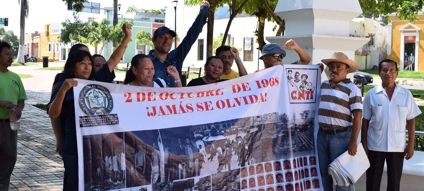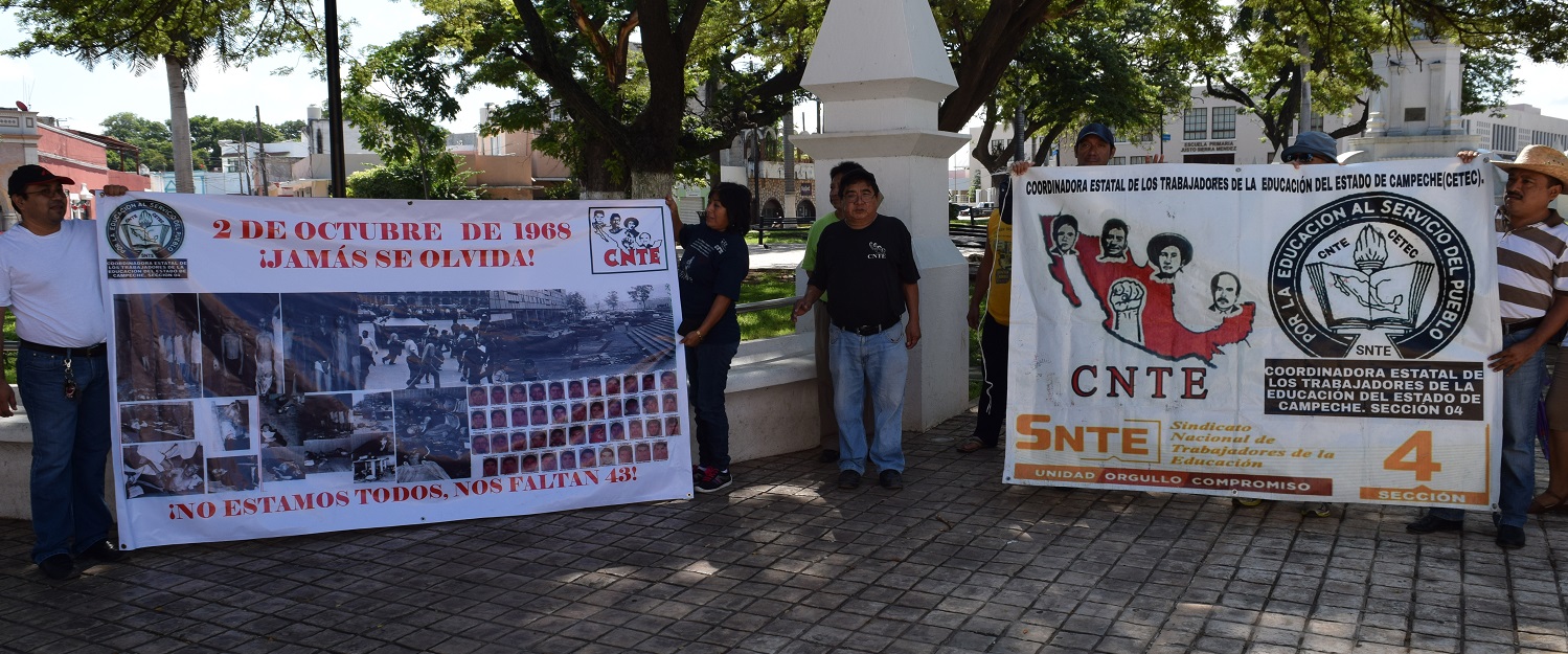 2mae Maestros de la Coordinadora hacen un pronunciamiento en el XLVIII aniversario de la masacre estudiantil de 1968. 2mae1 Por Ronny Aguilar CAMPECHE, Cam. 2 de octubre del 2016.- La Coordinadora Estatal de los Trabajadores de la Educación de Campeche (CETEC) hizo un pronunciamiento por la masacre estudiantil de 1968 en el parque de San Martín de la capital, recordó a los caídos y denunció que hasta hoy, el gobierno mexicano continúa asesinando por represión. Al no reunirse las personas suficientes para realizar las actividades programadas, sino solo los integrantes de la CNTE, los maestros de la agrupación en Campeche decidieron realizar un pronunciamiento por el dos de octubre. Silverio Tuz Góngora, representante en Campeche de la agrupación, señaló que esta es  una fecha histórica, muy importante en la vida de nuestro país. “En este dos de octubre, mejor conocido como la matanza de Tlatelolco, esta actividad que realizamos es parte de las acciones nacionales que la Coordinadora Nacional de Trabajadores de la Educación ha realizado, ya que a partir de las 10 de la mañana, en la Ciudad de México, se lleva a cabo una marcha, saliendo por la calle Cinco de Mayo hasta el Zócalo”, expresó. “Desde 1968 hasta la fecha, todos los gobiernos de nuestro país solo han sabido reprimir a cada movimiento que se manifiesta, en aquel entonces, Gustavo Díaz Ordaz era presidente, el secretario de Gobernación era Luis Echeverría, se realizaron estos actos, porque supuestamente se iba a boicotear las Olimpiadas que estaban por realizarse en nuestro país”, recordó. Aunque resaltó que todo fue una farsa, ya que estudiantes del Politécnico Nacional y la UNAM, así como de otras universidades públicas, se habían estado manifestando, y “ese día convocaron una reunión los jóvenes y aprovechó el gobierno federal para usar la represión contra los manifestantes, donde no solo hubo estudiantes desaparecidos, sino padres, madres y niños, incluso hasta los vecinos de Tlatelolco”. “Se atrevieron a entrar a cada uno de los edificios para acribillar a los que le daban refugio a los estudiantes que huían de la masacre, por eso los maestros nos hemos pronunciado para no dejar desapercibido esto, ya vimos que desde esa fecha, se han cometido varios casos de autoritarismo del gobierno”, agregó. Recordó que actualmente hay varios casos que encarnan aquella brutalidad, como el caso de Acteal, Tlatlaya, Ayotzinapa, Apatzingán y más recientemente Nochixtlán. “Todas las represiones han sido no solo contra los estudiantes, sino incluso en contra de los maestros que se atreven a levantar la voz, por eso es necesario unificar las luchas y ver qué vamos hacer con este gobierno, porque no podemos dejar que se cometan más injusticias por este gobierno fascista y represor, ellos reprimen para que nos de temor y miedo de salir a las calles”, indicó. Puntualizó que no se debe permitir que el Estado cree una sociedad sumisa, obediente y sin voz, por eso avisó que va a seguir manifestándose y a continuar en pie de lucha hasta alcanzar sus objetivos.