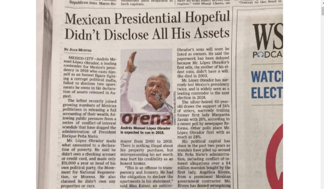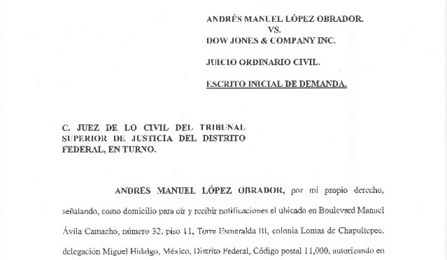 CIUDAD DE MEXICO, 11 de octubre del 2016.- La noche del lunes, Andrés Manuel López Obrador, presidente del Comité Ejecutivo Nacional de Morena, presentó una demanda por daño moral en contra del periódico Wall Street Journal, que publicó que había ocultado dos departamentos de su propiedad en su declaración 3 de 3. A las 20:32:23 horas de este 10 de octubre, la demanda con 11 fojas fue presentada en el Juzgado 73 de lo Civil 119 Ordinario del Tribunal Superior de Justicia del Distrito Federal y cuenta con el sello de la Oficialía de Partes Común 36 Civil. “Hoy presentamos la demanda por daño moral contra el Wall Street Journal. Aunque parezca increíble o soberbio, la honestidad es lo que estimo más importante en mi vida”, expresó López Obrador en su cuenta de Facebook. “Les comparto los documentos y mañana estarán disponibles en la página amlo.org.mx los anexos: el juicio intestamentario de 2003 y la escritura pública donde cedo, desde 2005, todos los bienes a mis hijos”, puntualizó. El político de izquierda confió en ganar la demanda al periódico estadunidense y reiteró que “la indemnización la donaremos a niños migrantes deportados”.