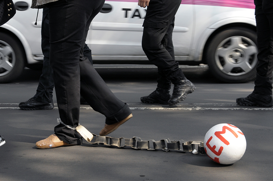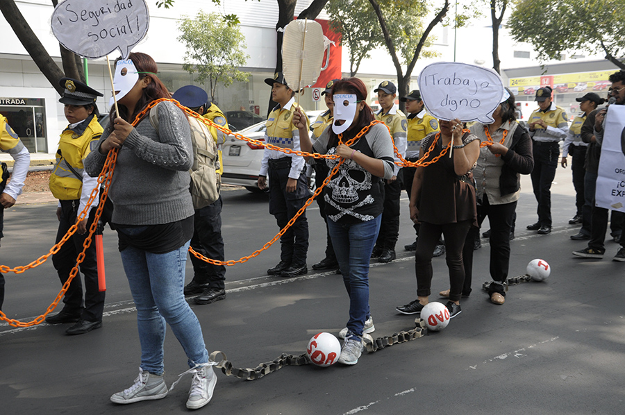 17ex Llevan 10 meses despedidas y su situación no se define/CIMACFoto: Gema Villela Valenzuela Por Gema Villela Valenzuela Cimacnoticias CIUDAD DE MEXICO, 17 de octubre del 2016.- Simularon tener grilletes en sus pies y marcharon hasta la Junta Local de Conciliación y Arbitraje (JLCyA) -donde se realizó una audiencia sobre su caso – para manifestarse en contra de la “esclavitud moderna” de las y los trabajadores. Son las extrabajadoras del Instituto de Educación Media Superior (IEMS) despedidas en enero pasado, que salieron desde las instalaciones de la Universidad Autónoma de la Ciudad de México (UACM) para llegar a la Junta de Conciliación donde permanece su caso. La vocera de las trabajadoras, Guadalupe Carrasco Carrasco, dijo que el sistema de subcontratación outsourcing esclaviza a las y los trabajadores porque reduce sus prestaciones, violenta derechos laborales y reduce su seguridad social. La Asamblea Nacional de Trabajadores del gobierno de la Ciudad de México, que a la fecha ha interpuesto 53 denuncias ante la JLCyA cuyos juicios no han tenido seguimiento, se solidarizó con las trabajadoras y las acompañó para hacer presión ante esta instancia donde se dirimen los conflictos laborales, “para que su denuncia sí tenga seguimiento”. 17ex1 CIMACFoto: Gema Villela Valenzuela Las extrabajadoras continúan pidiendo su reinstalación, su base laboral y el pago correspondiente a la antigüedad de cada una, por los años trabajados para el gobierno de la Ciudad de México. Al llegar a las instalaciones de la JLCyA se separaron del grupo manifestante y entraron al edificio en donde tenían cita para continuar la audiencia de seguimiento a su denuncia en contra del gobierno capitalino, misma que inició el pasado 21 de septiembre. El integrante del Comité Cerezo México, Alejandro Cerezo Contreras, quien se encarga de la vigilancia y observancia de los Derechos Humanos de las trabajadoras, explicó que en esta audiencia continuará el desahogo de pruebas que demostrarán que las 65 trabajadoras sí trabajaban de manera directa para el gobierno capitalino y no para la empresa de outsourcing denominada “ROCMAN S.A de C.V”.