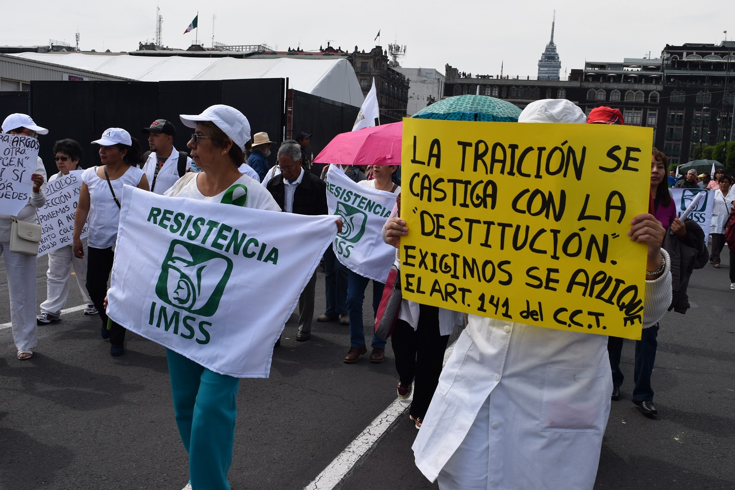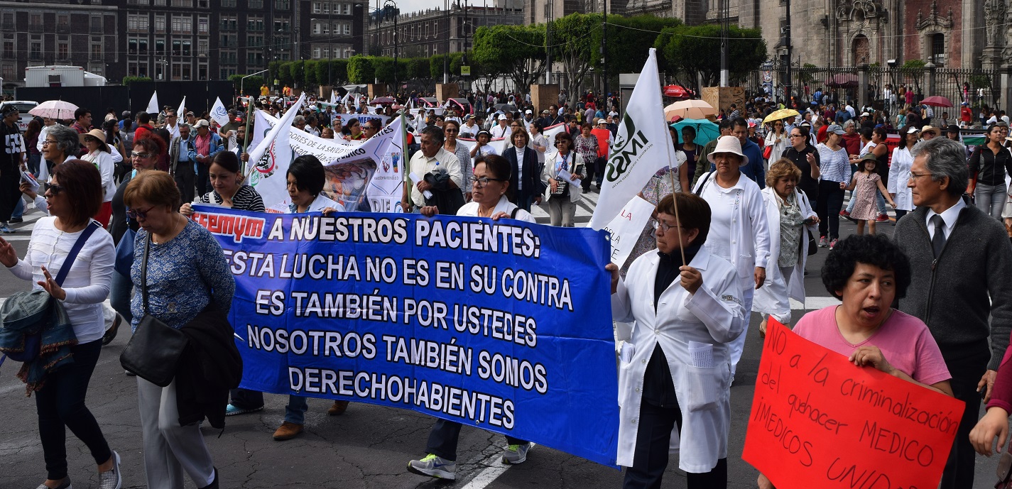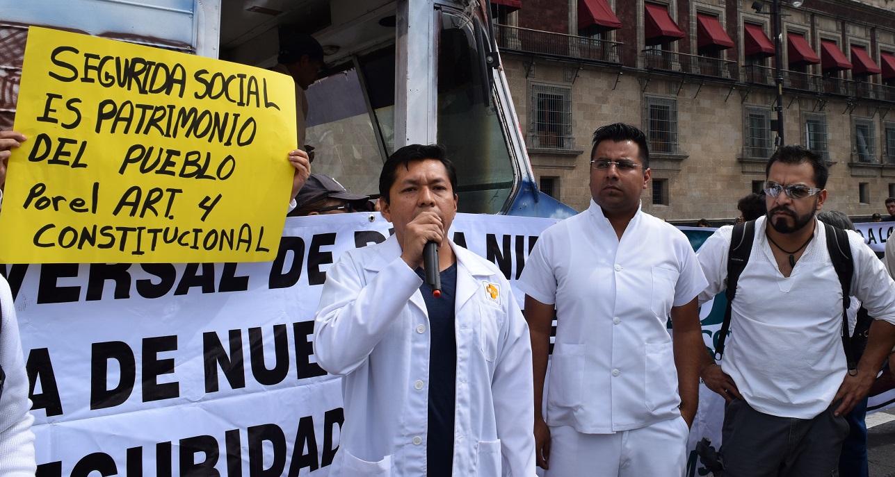 Los manifestantes de la Coordinadora Nacional de Trabajadores en Defensa de la Salud y de la Seguridad Social indicaron que no van a permitir que se privatice la salud pública en favor de los capitales económicos nacionales e internacionales. Señalaron que son una mentira los sueldos elevados de los médicos, siendo que los políticos ganan más y no hacen nada, además de que en los Institutos de Salud los hacen trabajar sin medicamentos, prescribiendo las medicinas que hay y no lo que se debe aplicar, porque dentro de las estructuras de los hospitales no se cuenta con el equipamiento técnico y médico para diagnósticos apegados a la ciencia, mientras que en el IMSS, se tiene un importante desabasto de medicamentos, afectando a los derechohabientes, que pasan meses sin atención médica. Hicieron un llamado a la ciudadanía para avanzar en la lucha, ya que de lo contrario será una privatización inminente, tal como sucedió con la Reforma Energética y la Reforma Educativa.