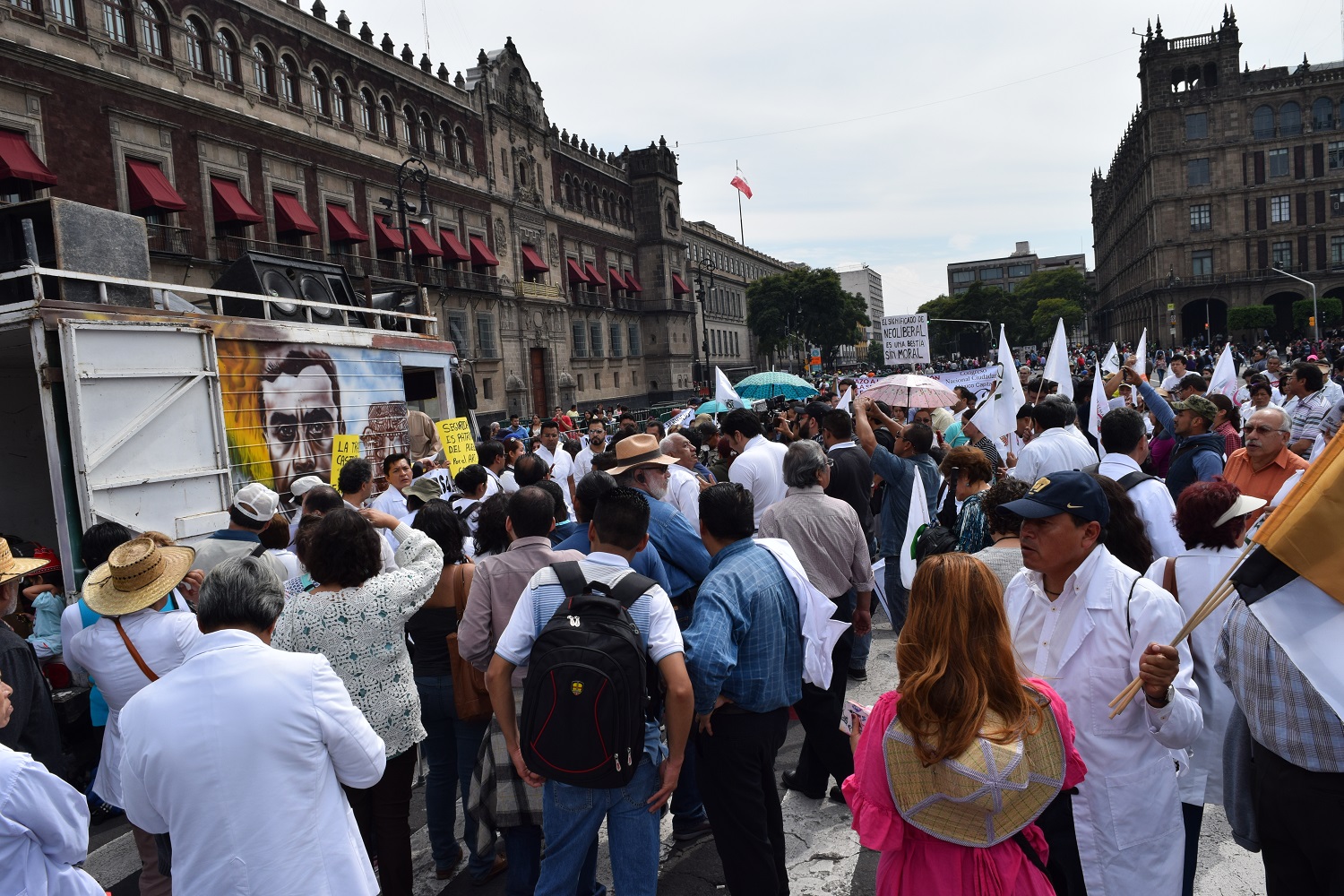 Miles de profesionales de la medicina se manifiestan en el Zócalo contra la privatización del sector salud, que pretende imponer el gobierno federal priísta.