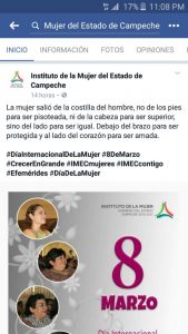 En Campeche, el Instituto Estatal de la Mujer difundió en sus redes sociales un mensaje a propósito del Día Internacional de la Mujer, que decía: “La mujer salió de la costilla del hombre, no de los pies para ser pisoteada, ni de la cabeza para ser superior, sino del lado para ser igual. Debajo del brazo, para ser protegida y al lado de corazón, para ser amada”.
