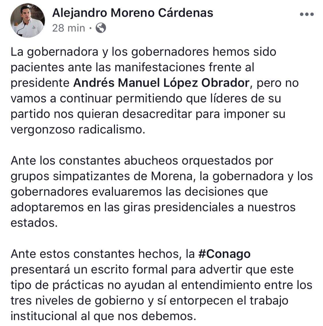 “Ante los constantes abucheos orquestados por grupos simpatizantes de Morena, la gobernadora y los gobernadores evaluaremos las decisiones que adoptaremos en las giras presidenciales a nuestros estados”, escribió.